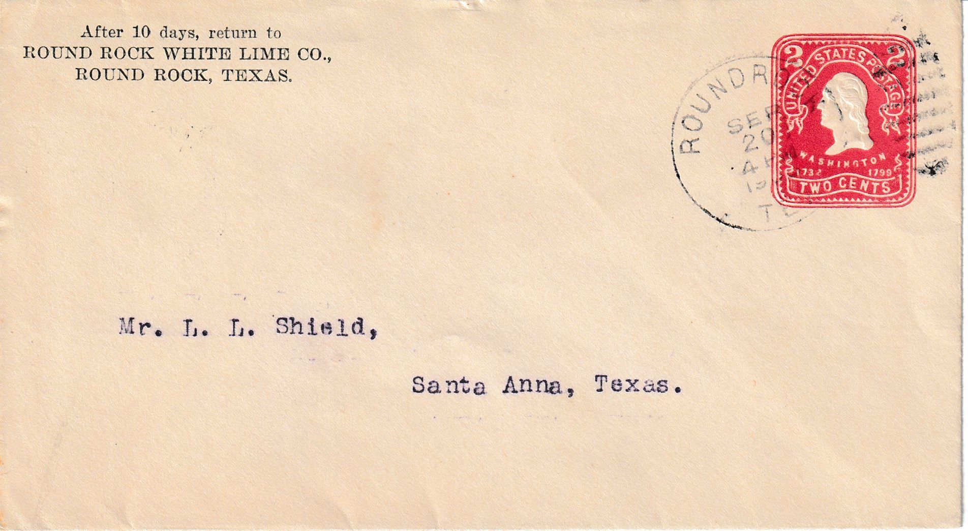 September 20, 1905 cover from the Round Rock White Lie Company, Round Rock, Texas to Mr. L. L. Shield, Santa Anna, Texas.Context