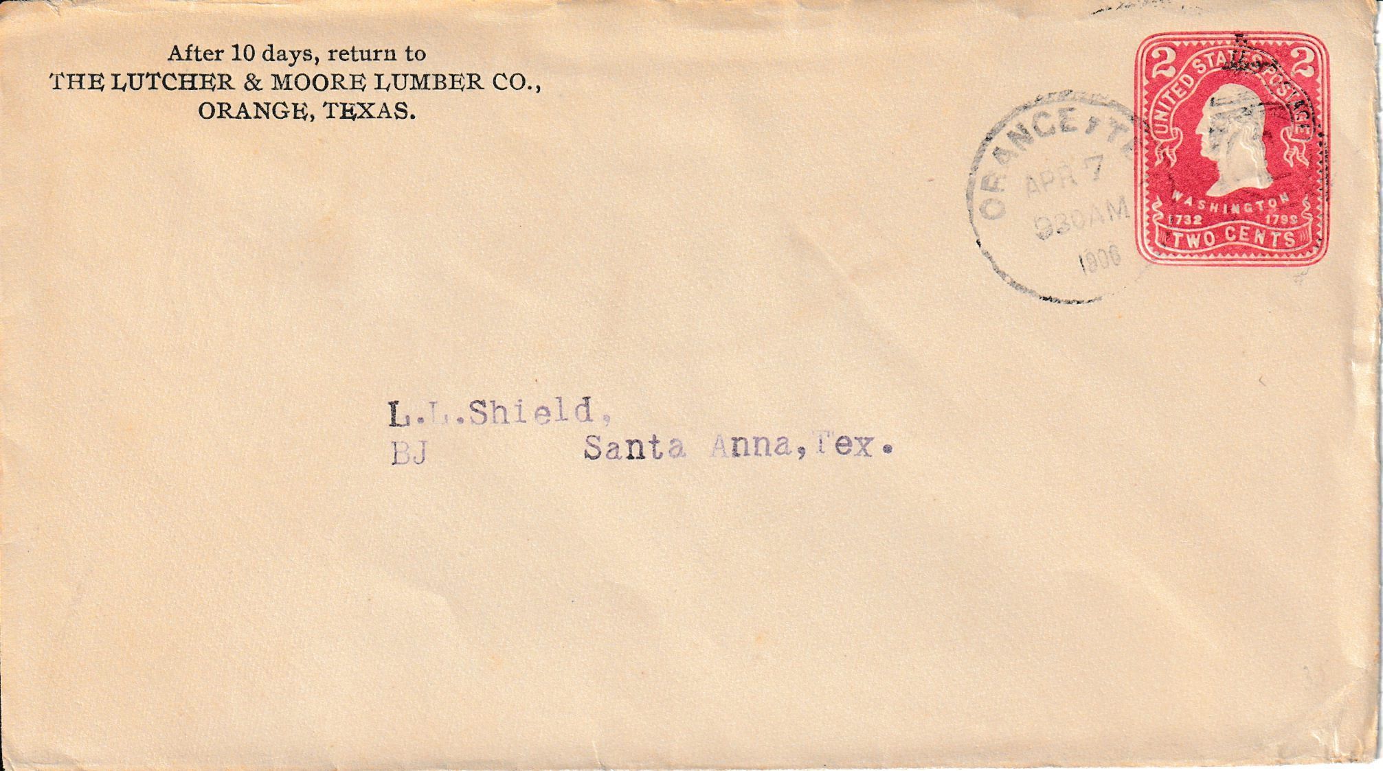 April 7, 1906 cover from The Lutcher & Moore Lumber Company to Leonidas Shield.Context