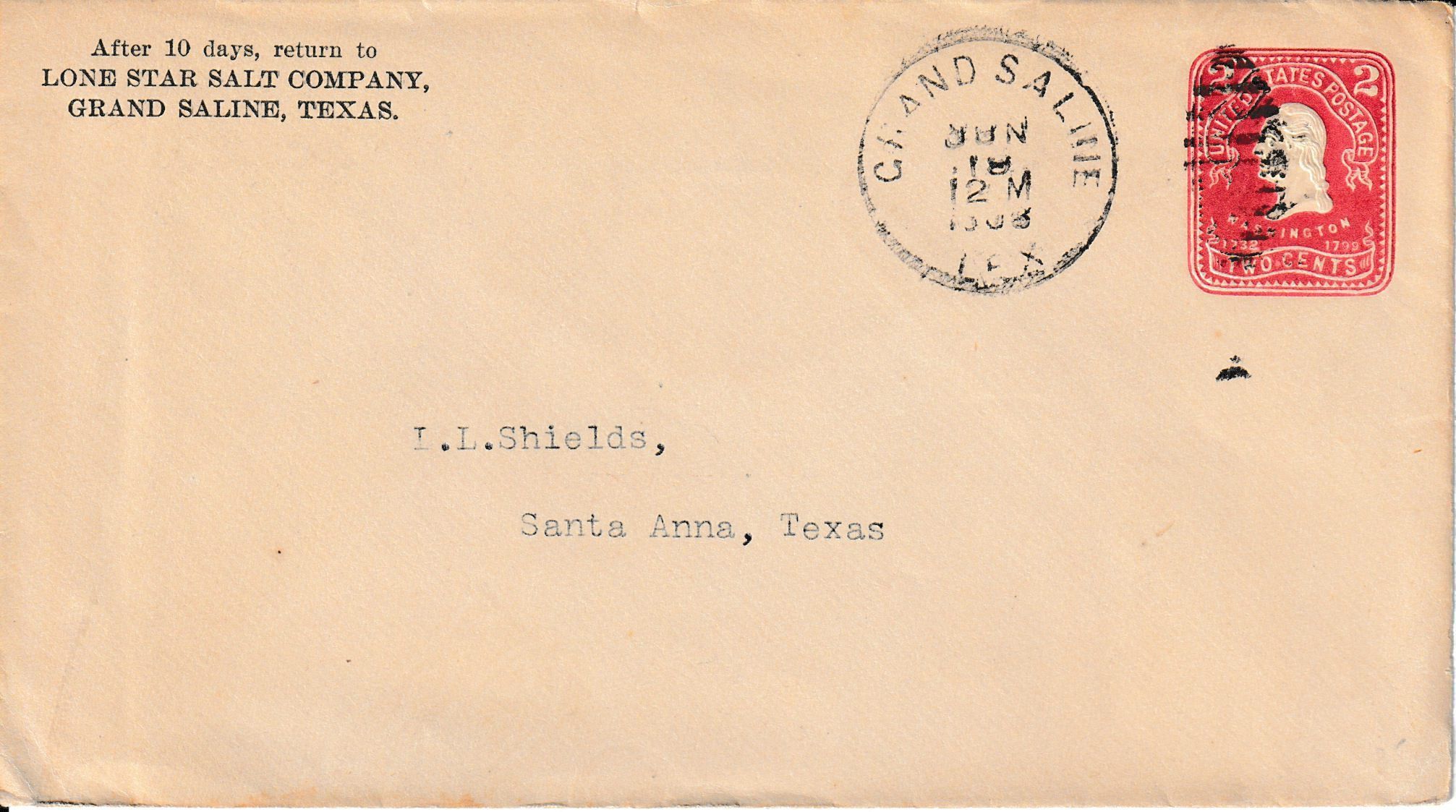 Cover from the "LONE STAR SALT COMPANY, / GRAND SALINE, TEXAS" postmarked June 18, 1906 in Grand Saline, Texas and addressed to "L.L. Shields, / Santa Anna, Texas."Context