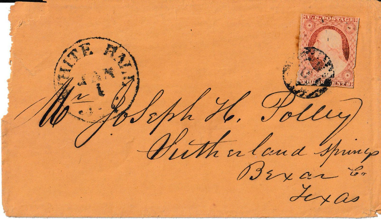 Antebellum cover from Whitehall, New York addressed to “Joseph Henry Polley, Sutherland Springs, Bexar County, Texas.”Context