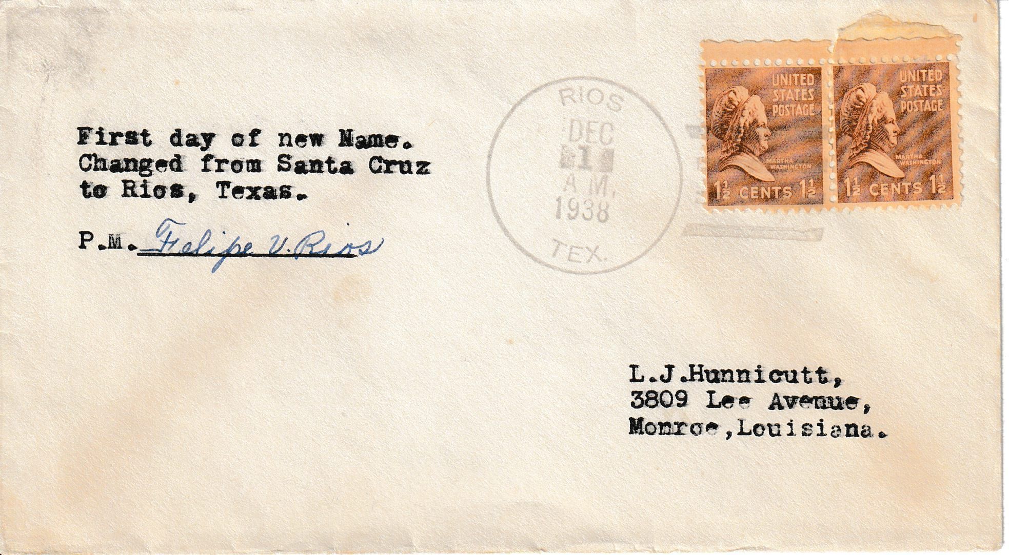 A “First Day of New Name” cover postmarked on December 1, 1938, on the first day of business of the Rios Post Office. Signed by the postmaster.Context