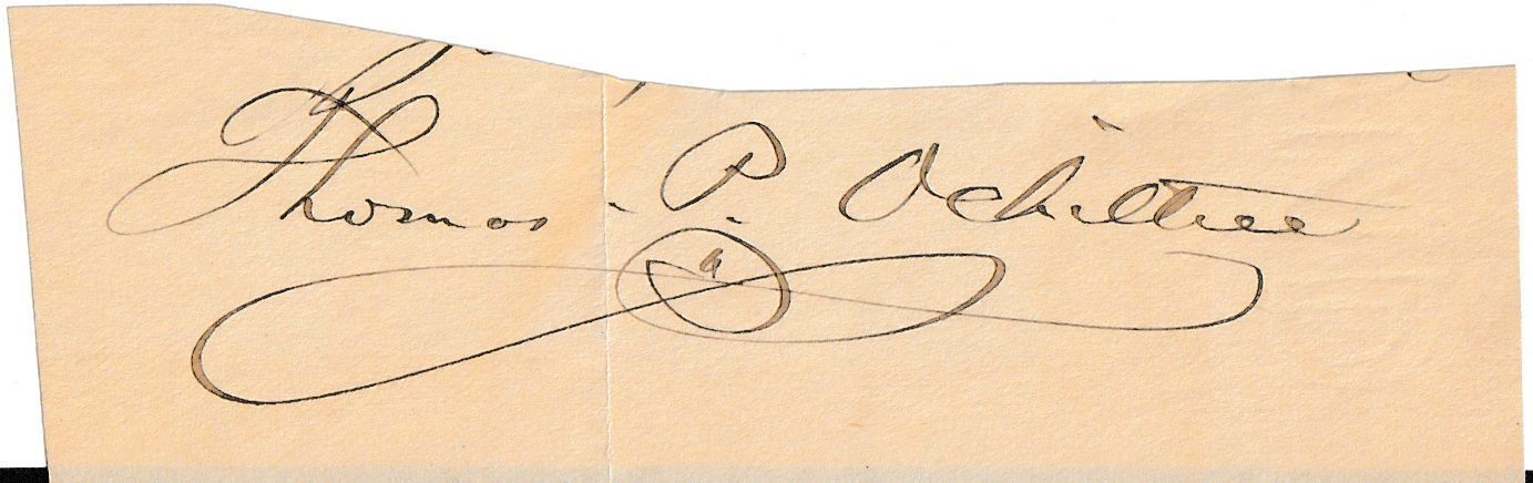"Thomas P. Ochiltree" signature cut from a letter addressed to politician David Bremner Henderson. These two men served together in the U.S. House of Representatives from 1883-1885; Henderson represented Iowa's 3rd District and Ochiltree represented Texas's 7th District.Context