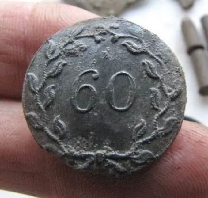 Circa 1775 - 1783 British army pewter 25 mm coat button with a "60" encircled by a wreath of leaves.Context