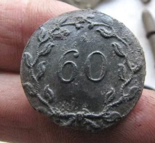 Circa 1775 - 1783 British army pewter 14 mm coat button with a "60" encircled by a wreath of leaves.Context