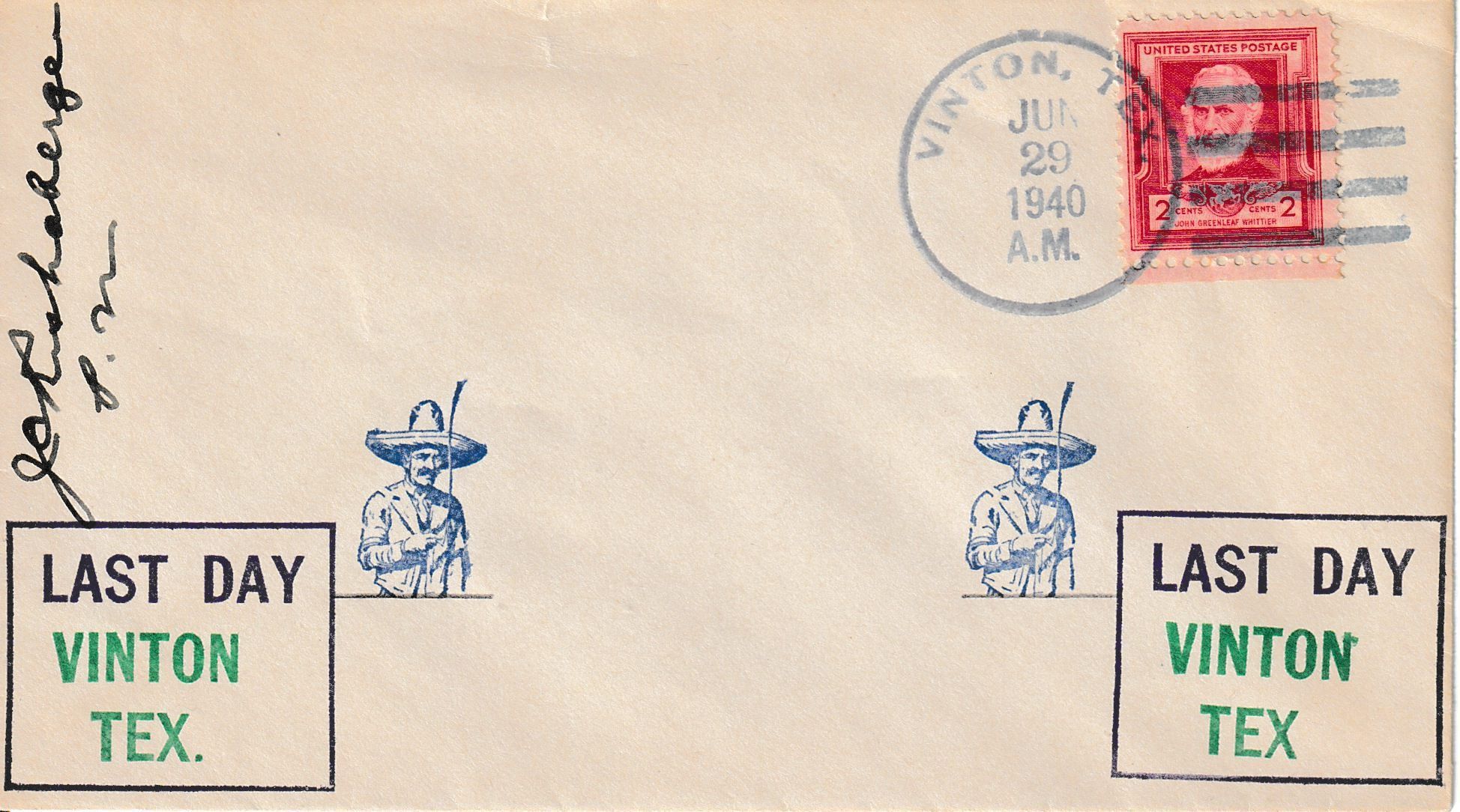 A “Last Day” cover postmarked on June 29, 1940 and signed by the postmaster on the final day of business of the Vinton Post Office.Context