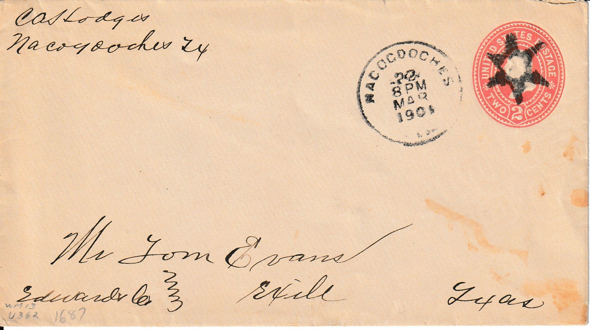 March 20, 1901 cover from Charles Hodges, Nacogdoches, Texas with fancy star CCL to Tom Evans, Edwards County, Exile Texas. On verso is Sabinal, Texas postmark.Context