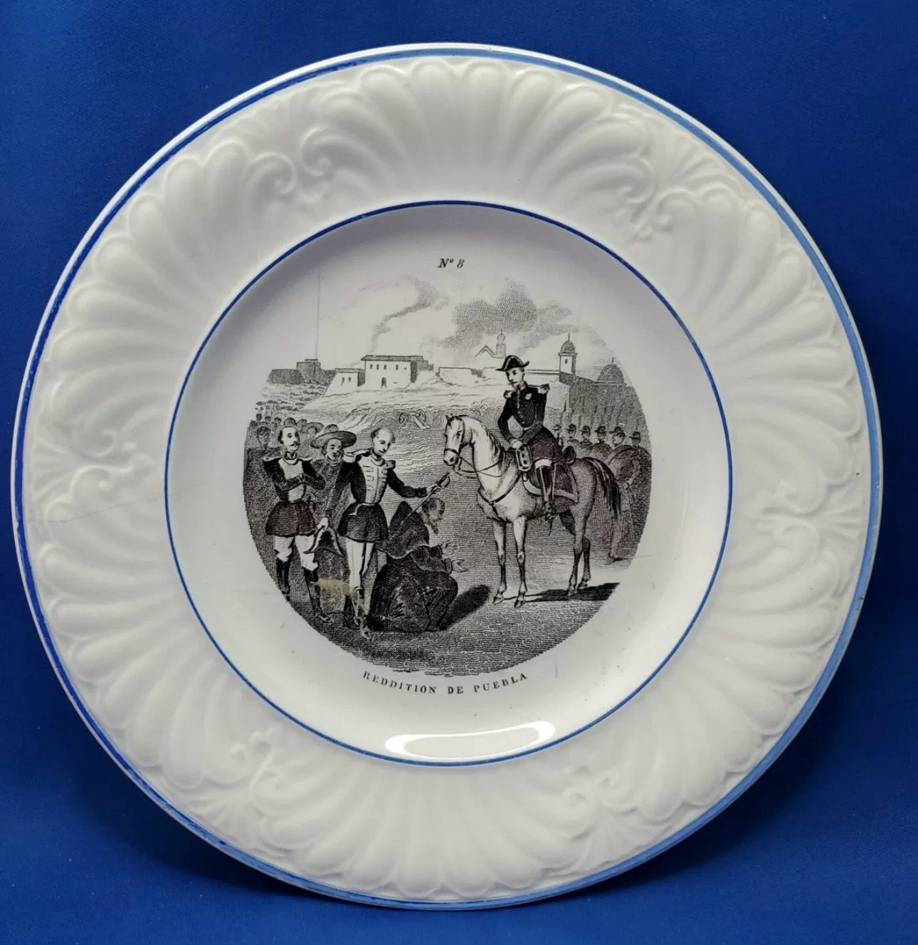 Number 8, French 7 3/4" plate, transfer printed in black on a white earthenware body. It pictures the "Surrender Of Puebla". A double band of French Blue lining borders a raised shell form embossed rim with the illustration in the center of the plate. Showing the mark used in the 1800s, Creil et Montereau, Deposé, LM & Cie. for Lebeuf, Milliet & Co. (LM & Co.). No chipping, but a 2-inch hairline to the left of the graphic (pictured).Context