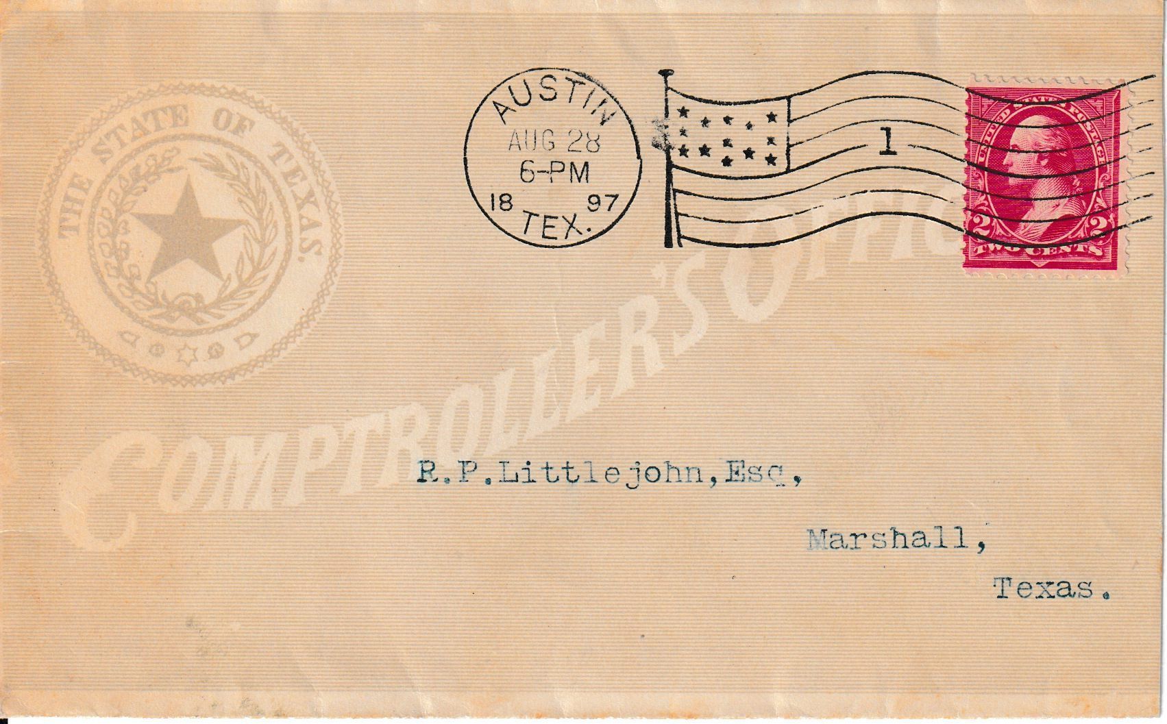 Official State of Texas Comptroller cover during the term of Richard W. Finley (Democrat, 1895–1900) to Robert Payne Littlejohn of Marshall, Texas.Context