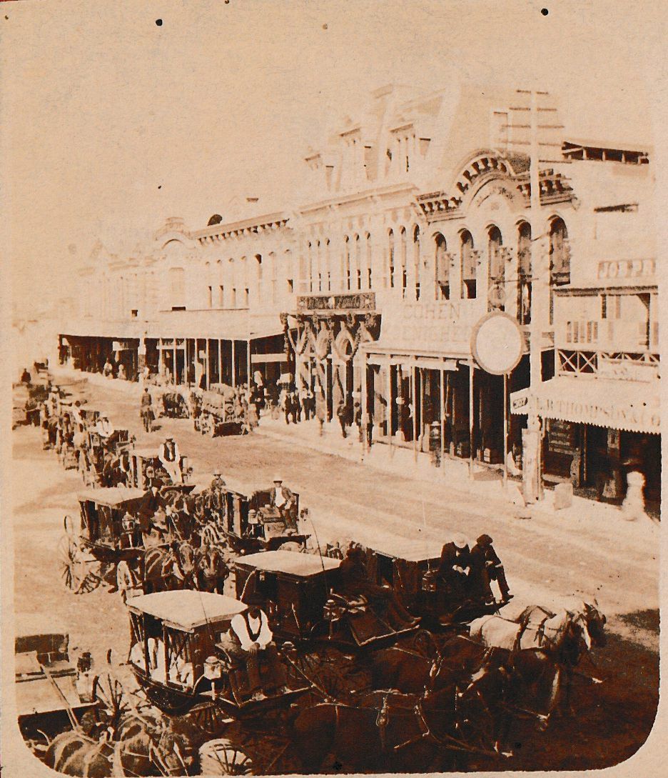 Stereo photograph of the north side of Main Plaza in San Antonio, Texas. There are several store fronts, including Cohen & Koenigheim, with carriages lining the area in front of the shops. A wagon loaded with barrels or casks is in front of the saloon, and wreaths and garlands hang from the front of the saloon. The building on the far right has an awning with the number 307 and the name R. Thompson & Co. (with a first initial hidden by a pole). A circular sign in the shape of a pocket watch hangs from the pole. The sign for a job printing establishment is visible on the second floor. White Elephant saloon is in the center.Context
