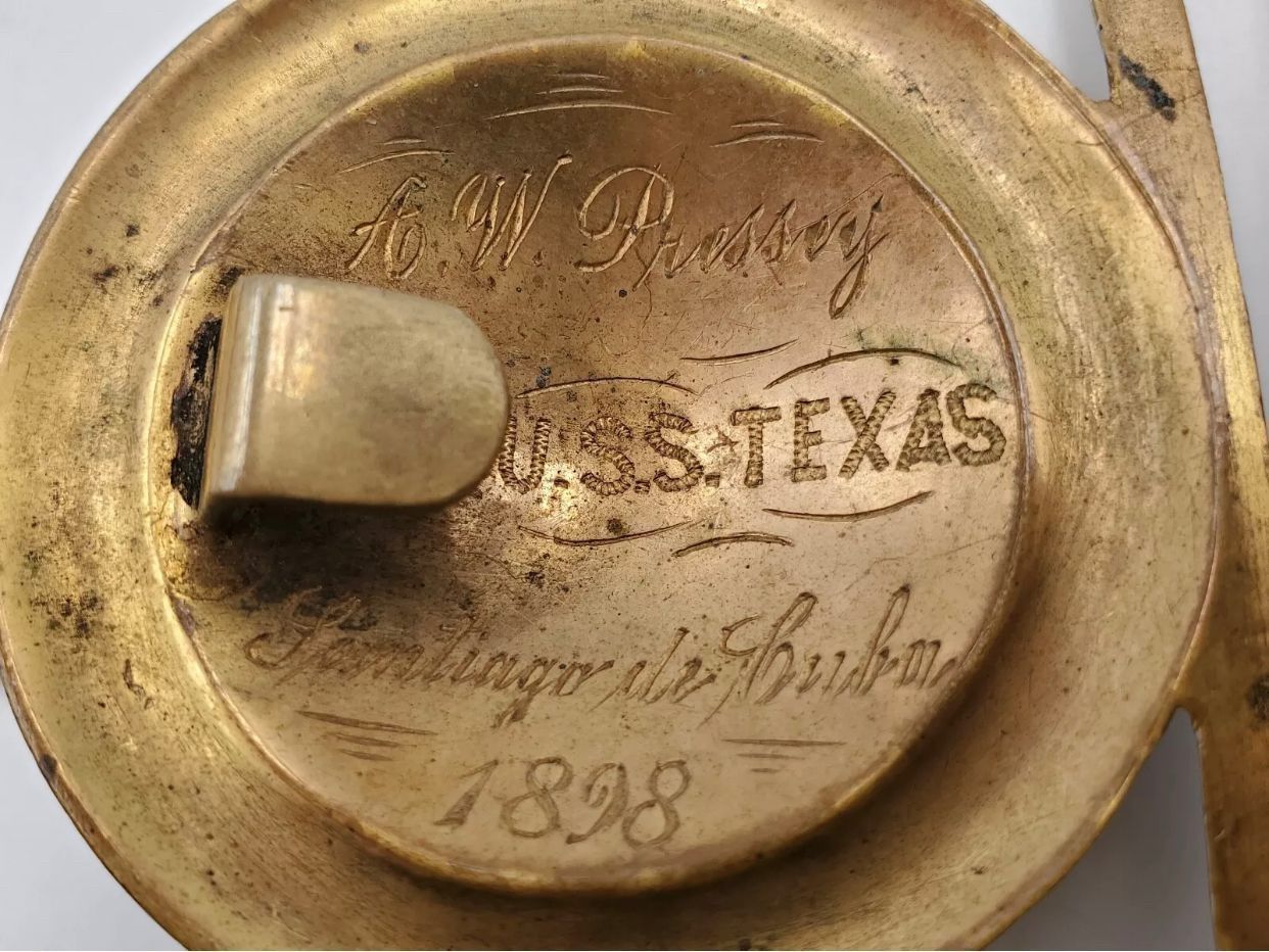 1898 United States Navy officer belt buckle worn by Naval Cadet A. W. Pressey on the USS Texas during the Battle of Santiago.