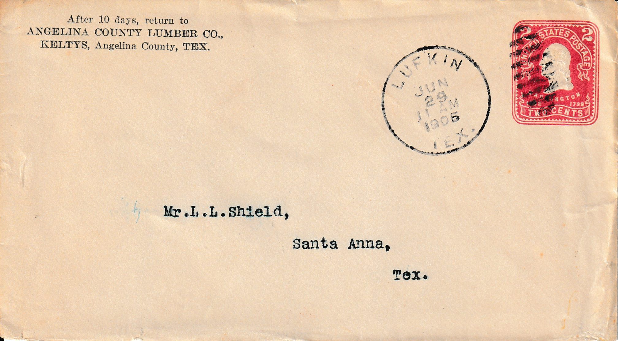 June 29, 1905 cover from the Angelina County Lumber Company to Leonidas Shield.Context