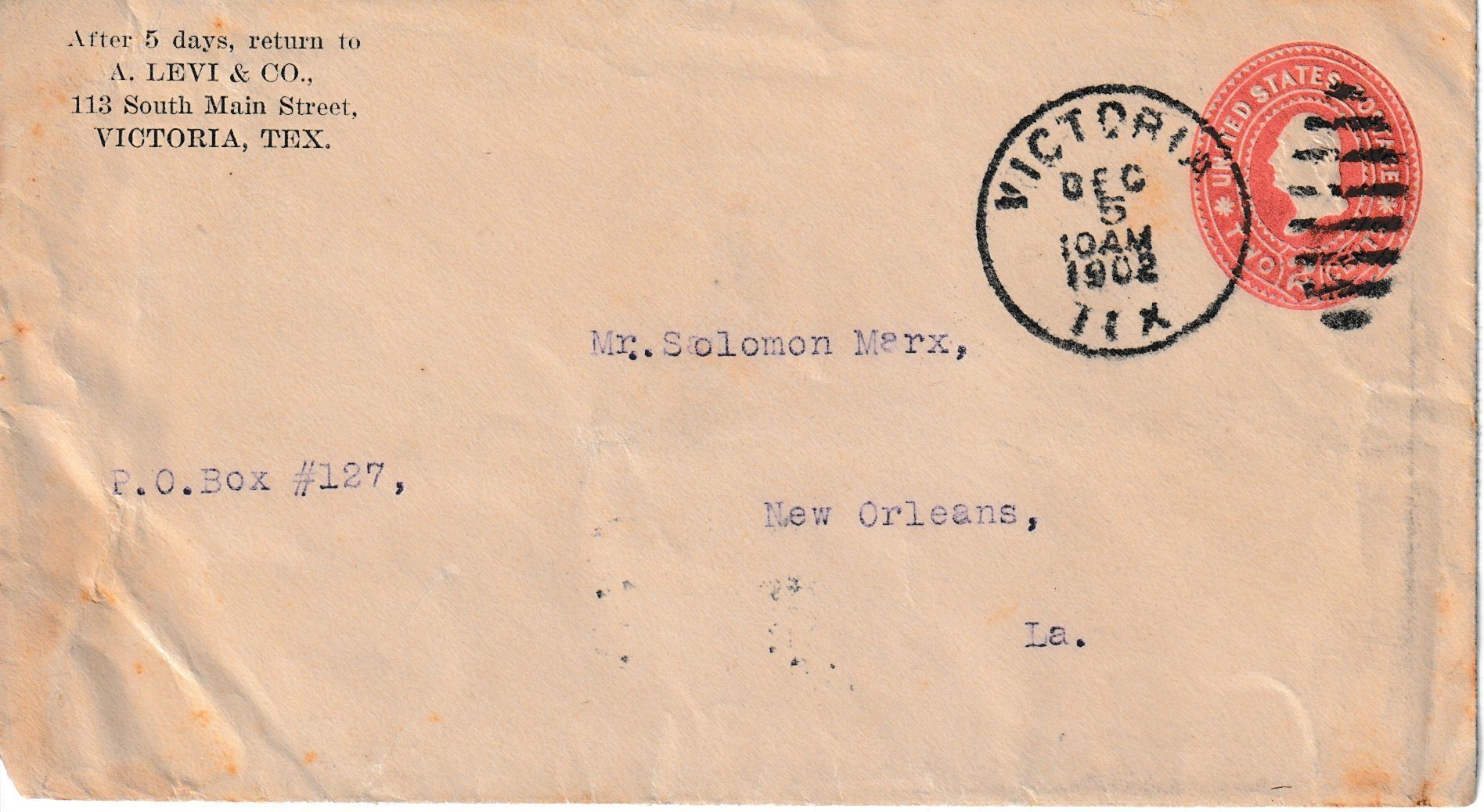 December 5, 1902 cover from “A. LEVI & CO., / 113 South Main Street / VICTORIA, TEX.” to “Mr. Solomon Marx, / New Orleans, / La.”Context