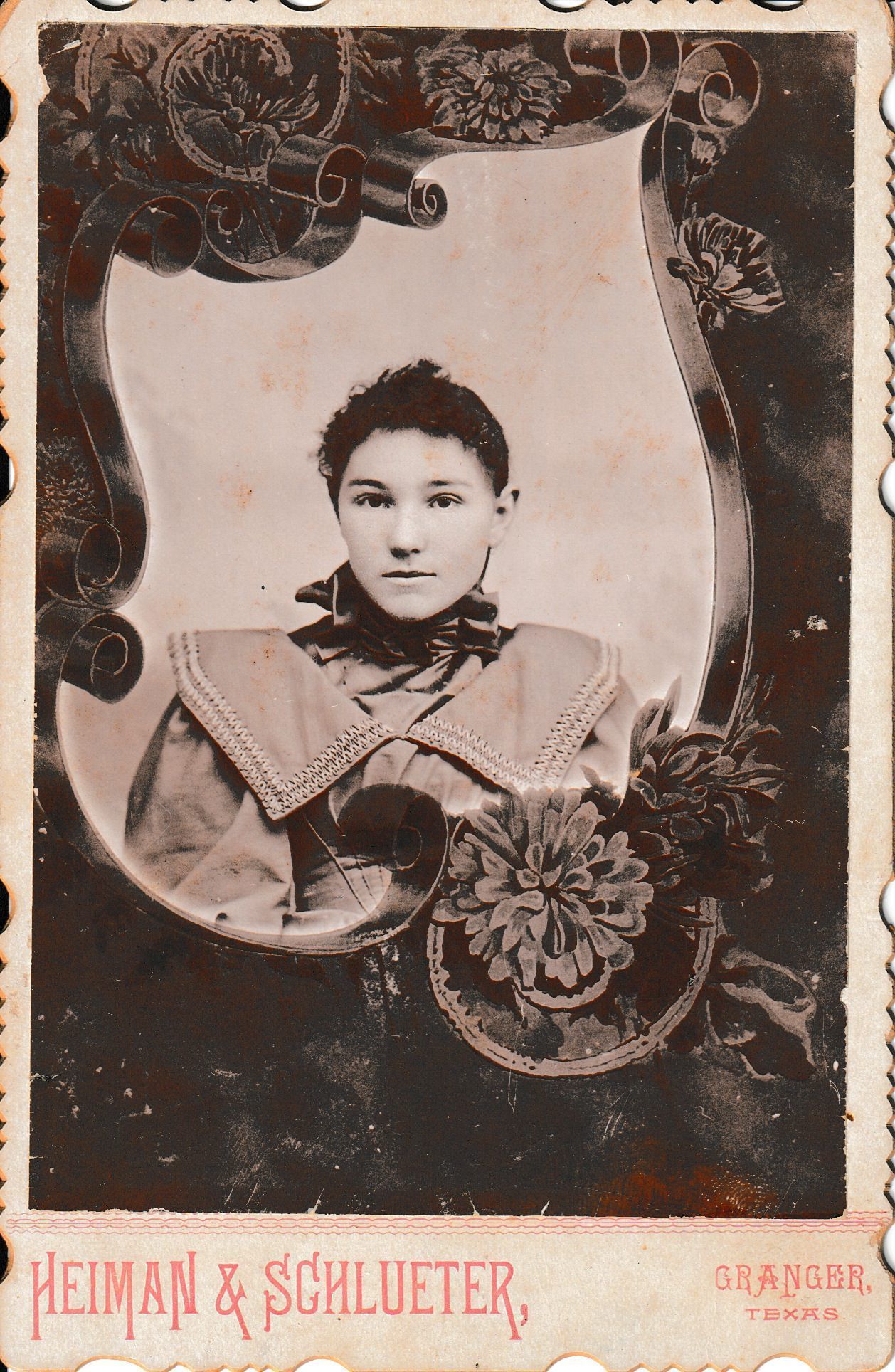 Circa 1893 cabinet card by Granger, Texas photographers Heiman & Schleuter of Gertrude Dyches.Context