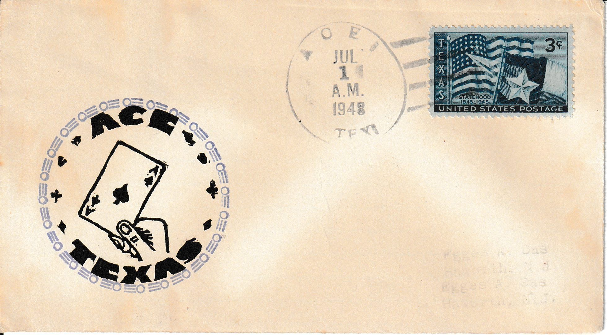 Ace cacheted cover with postmarked Texas Centennial stamp on July 1, 1948.Context