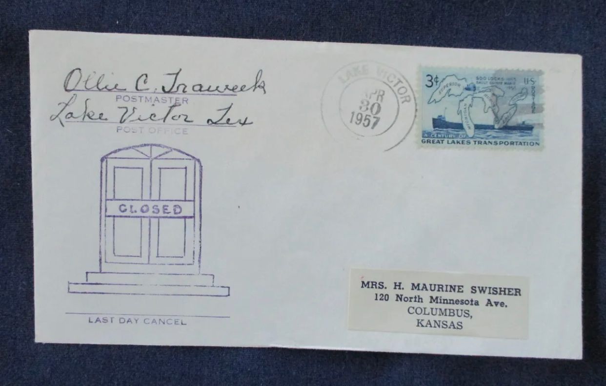 A “Last Day” cover postmarked on April 30, 1957 and signed by the postmaster on the final day of business of the Lake Victor Post Office. Signed by the postmaster.Context