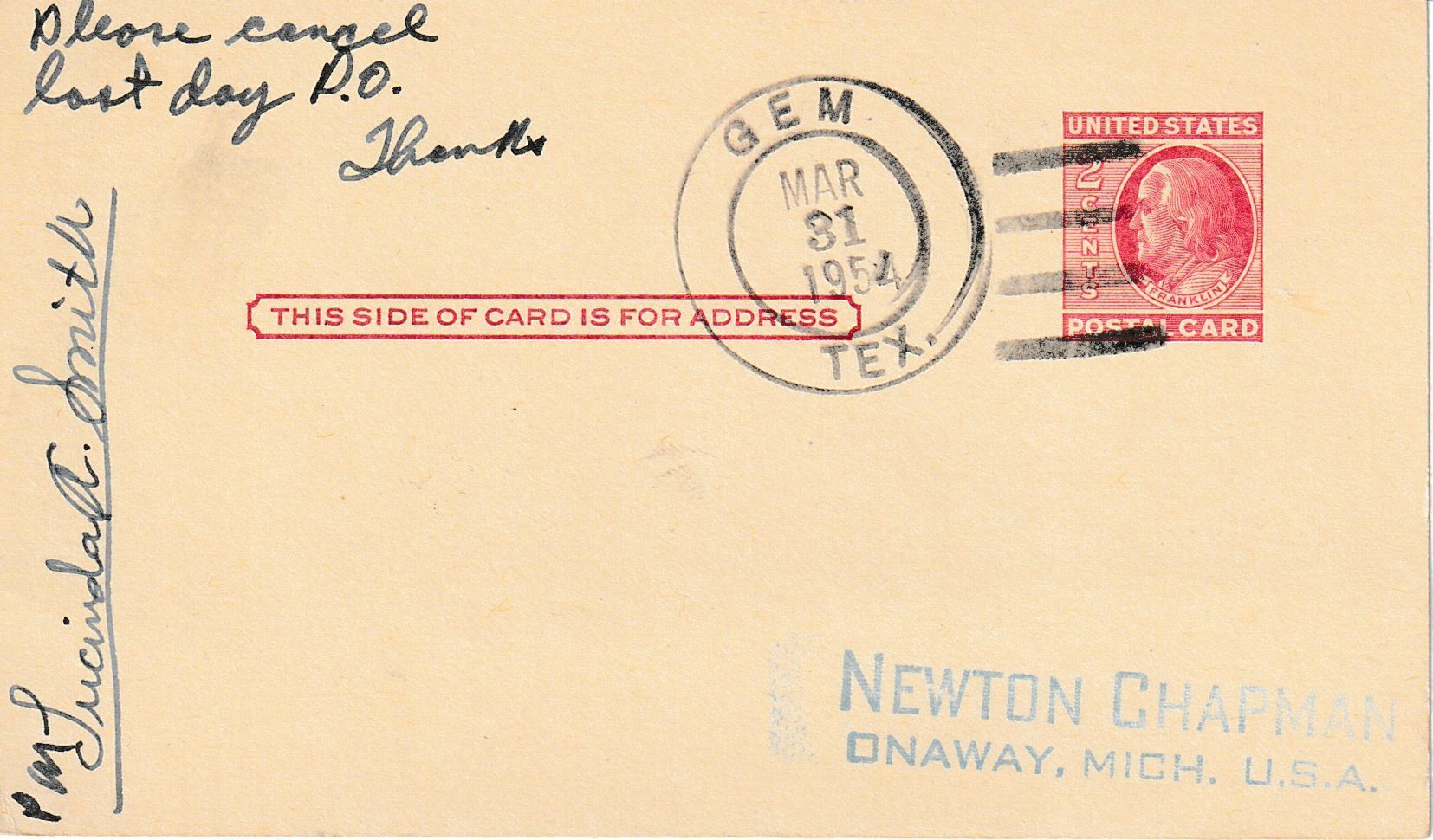 A “Last Day” postal card postmarked on March 31, 1954, on the final day of business of the Gem Post Office. Signed by the postmaster.Context