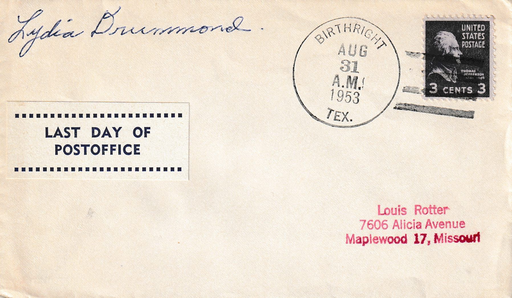 A “Last Day” cover postmarked on August 31, 1953, and signed by the postmaster, on the final day of business of the Birthright Post Office.Context