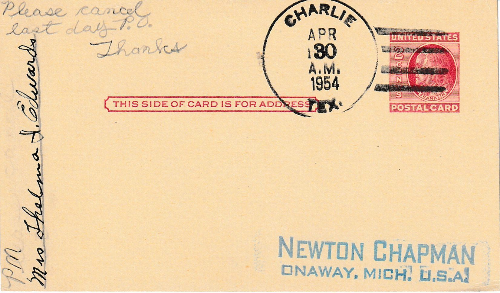 A “Last Day” postal card postmarked on April 30, 1954, on the final day of business of the Charlie Post Office. Signed by the postmaster.Context