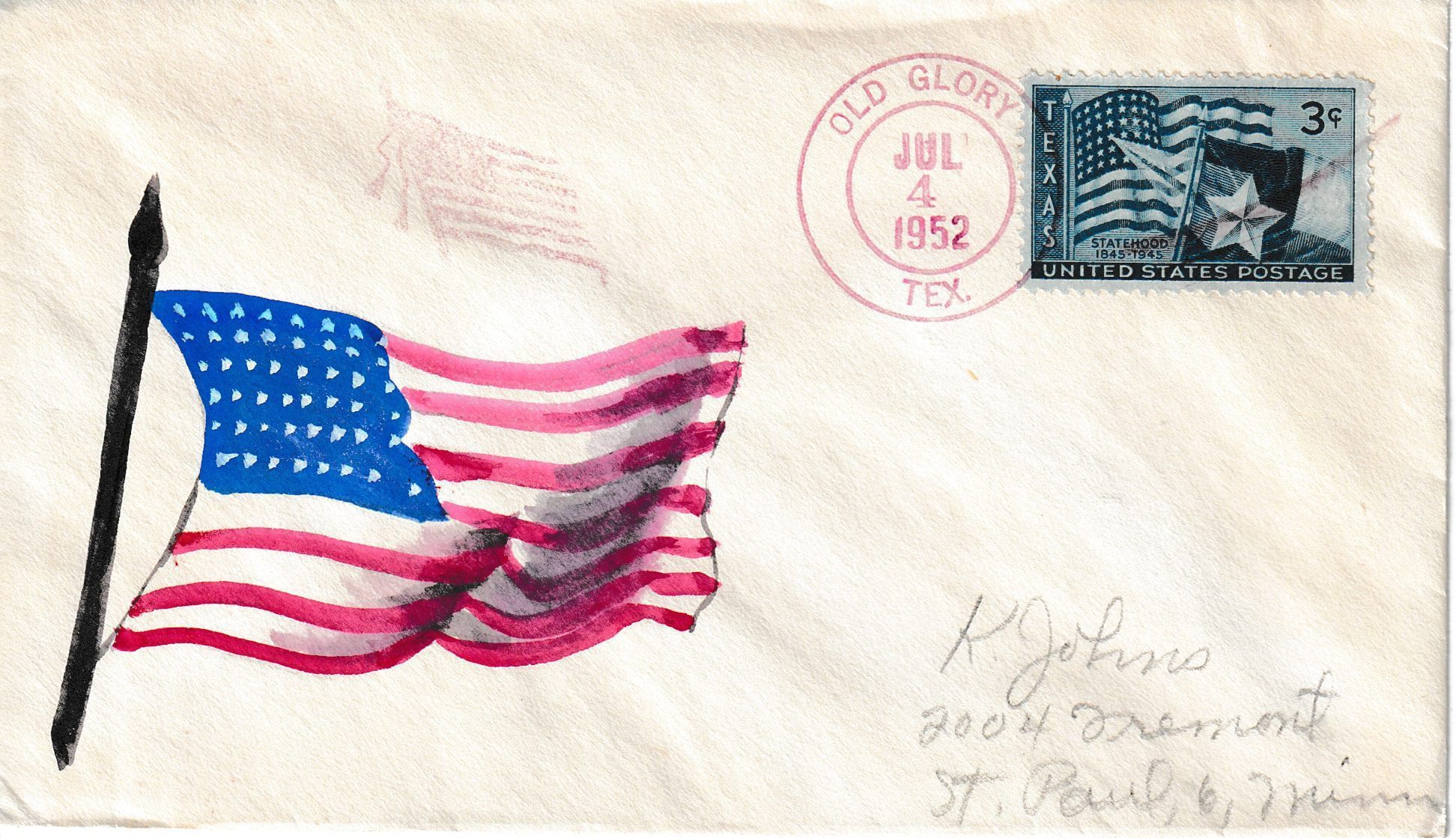 A hand painted watercolor cachet of the United States flag, postmarked in "OLD GLORY / TEX." on July 4, 1952, tied with a Texas Statehood Centennial stamp.Context