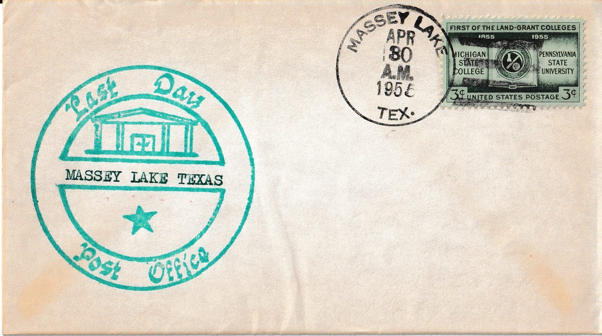 A “Last Day” cover postmarked on April 30, 1955, on the final day of business of the Massey Lake Post Office.Context