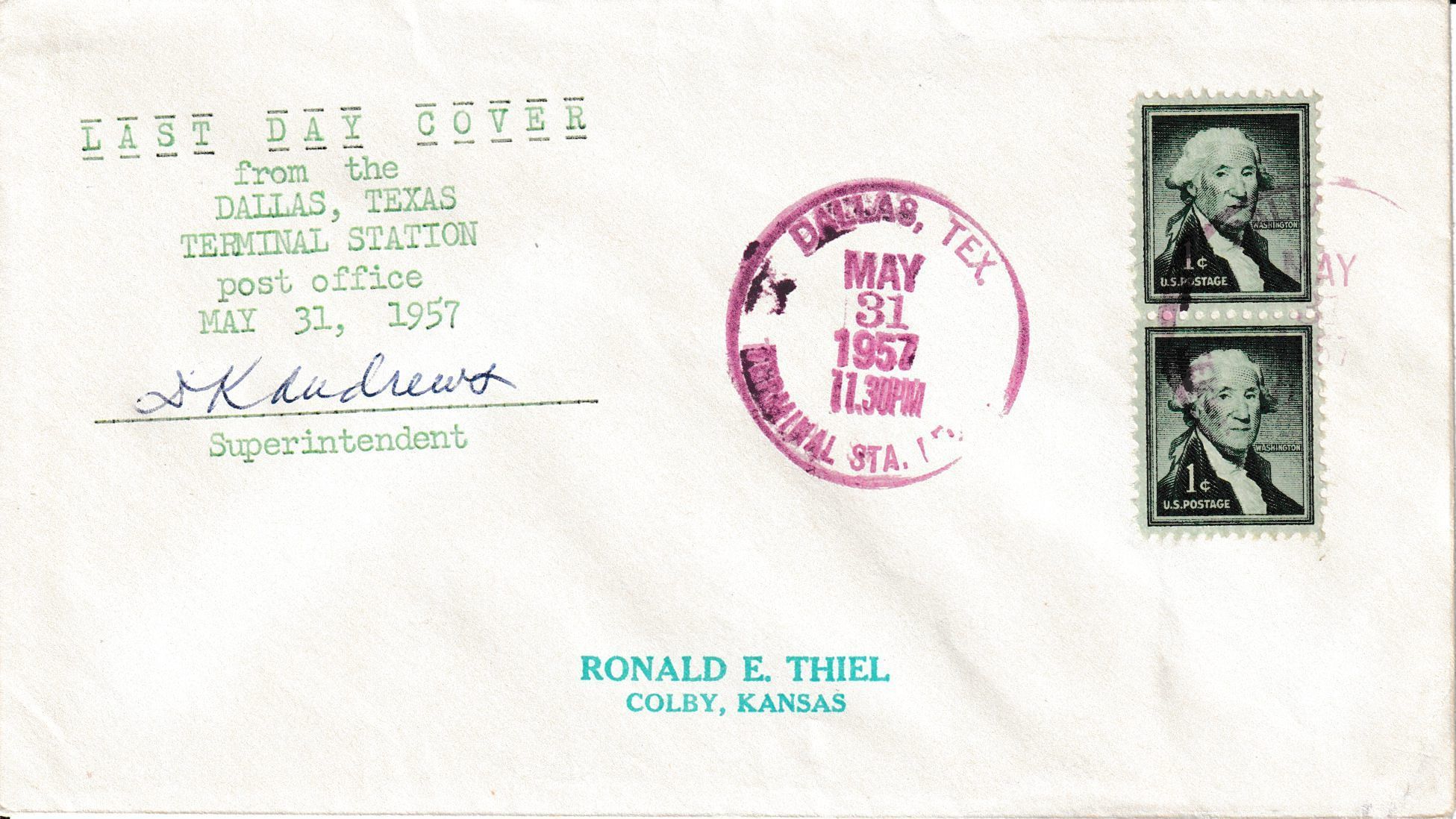 A “Last Day” cover postmarked on May 31, 1957 on the final day of business of the Dallas, Texas Terminal Station Post Office in the Union Terminal. Signed by the superintendent.Context