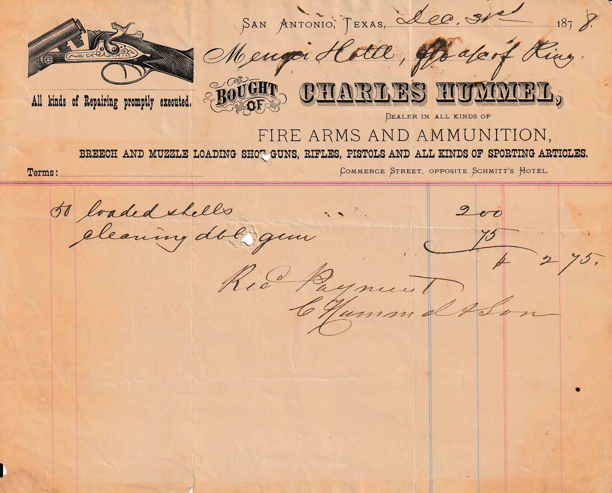 BOUGHT OF CHARLES HUMMEL, / DEALER IN ALL KINDS OF / FIRE ARMS AND AMMUNITION, / BREECH AND MUZZLE LOADING SHOT GUNS, RIFLES, PISTOLS AND ALL KINDS OF SPORTING ARTICLES. /