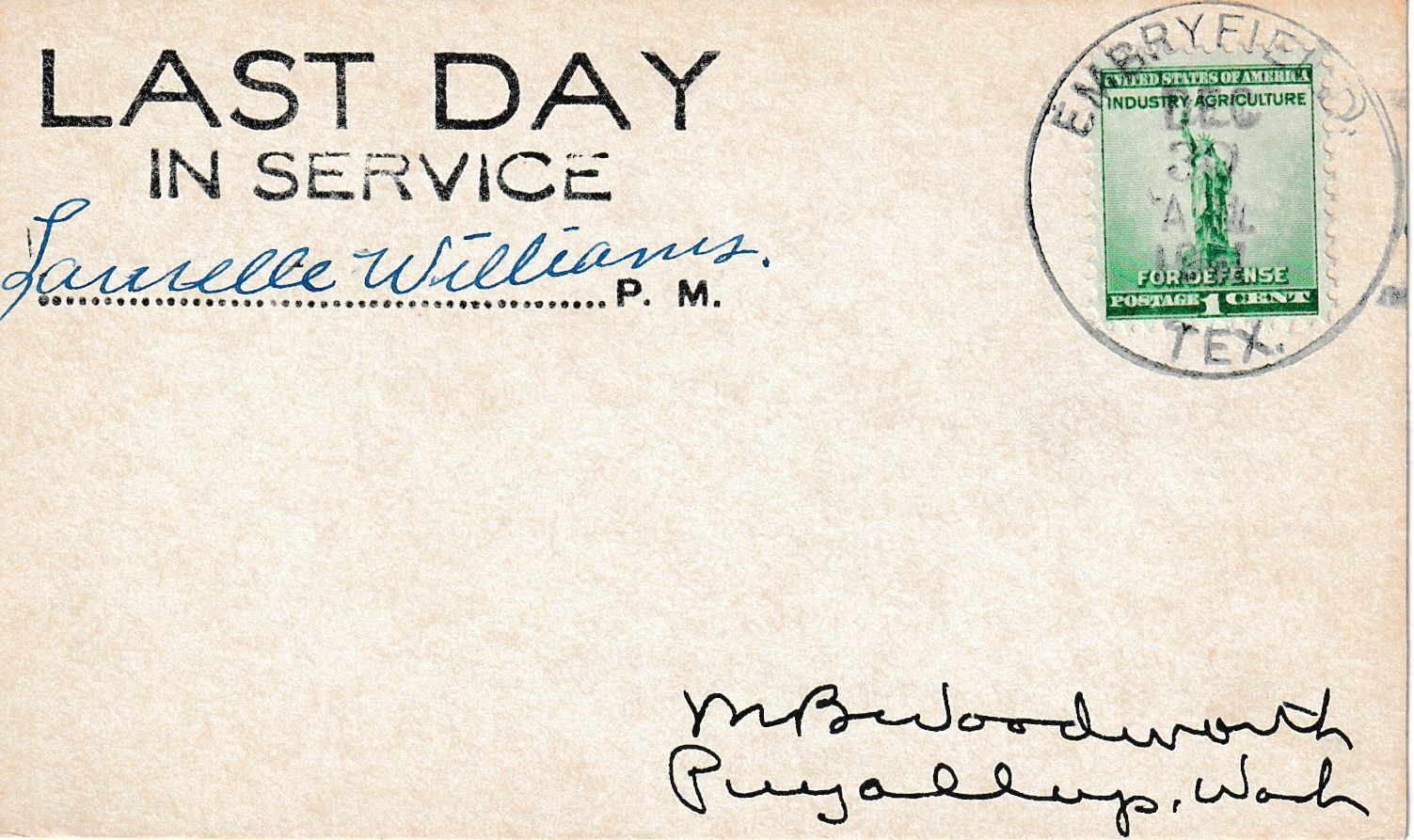 A “Last Day” postcard postmarked on December 30, 1941, on the final day of business of the Embryfield Post Office. Signed by the postmaster.Context