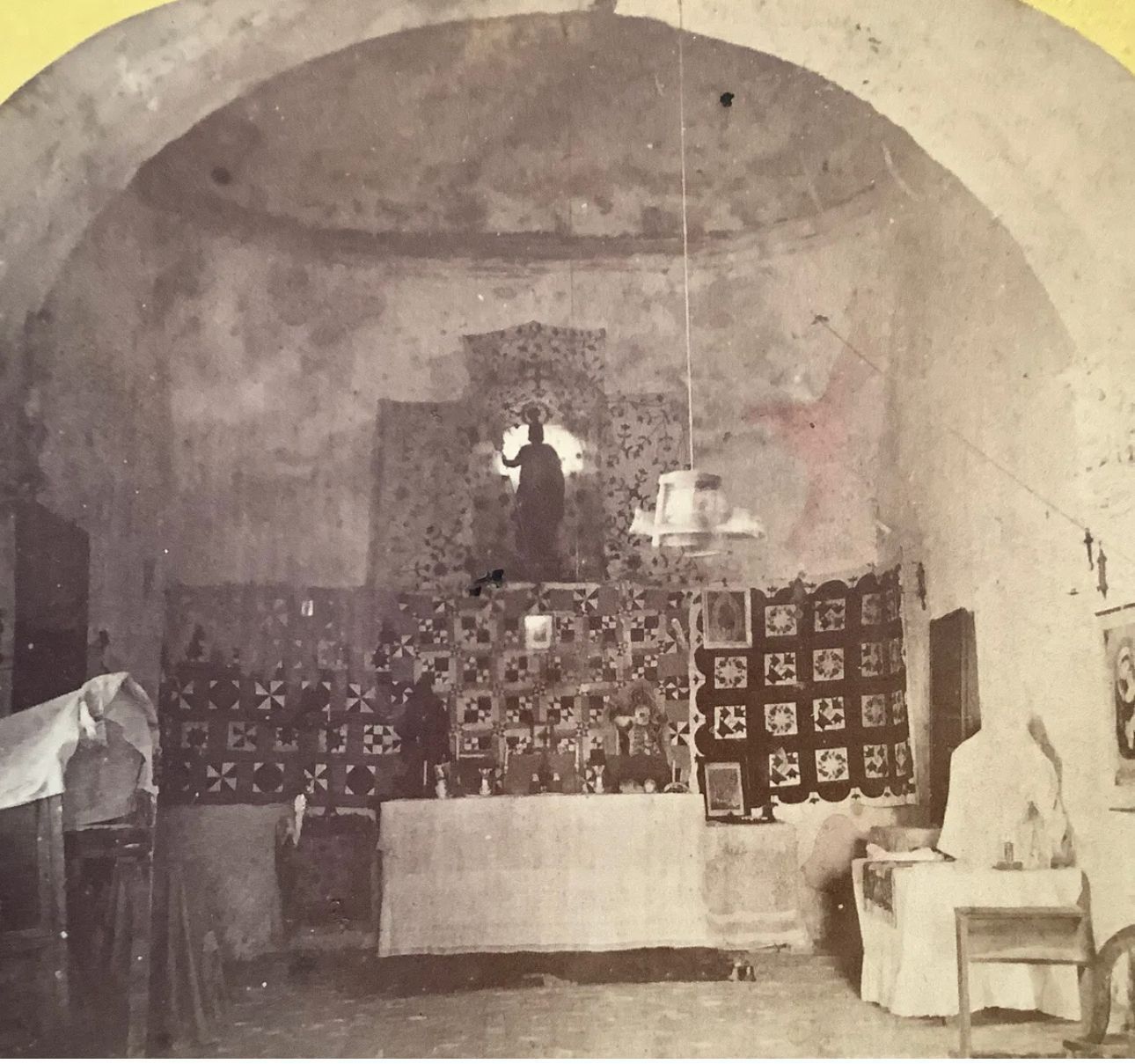 Henry A. Doerr stereograph of the interior of the Mission San Jose y San Miguel de Aguayo. Dated 1872 - 1875, due to the yellow, round-cornered mounts with a small "H. Doerr, Photographer, San Antonio Texas'' uniformly stamped in the center of the back.Context