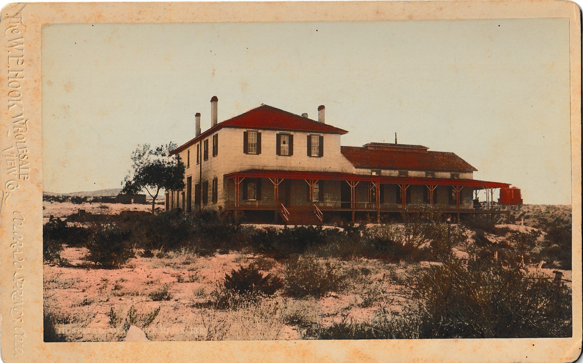 An 1882 cabinet card of the original Fort Bliss hospital by "The W. E. HOOK WHOLESALE VIEW CO., COLORADO SPRINGS, COLO." On verso (stamped in purple and ninety degrees counterclockwise): "From MEXICAN & INDIAN CURIO CO. / EL PASO, TEXAS."