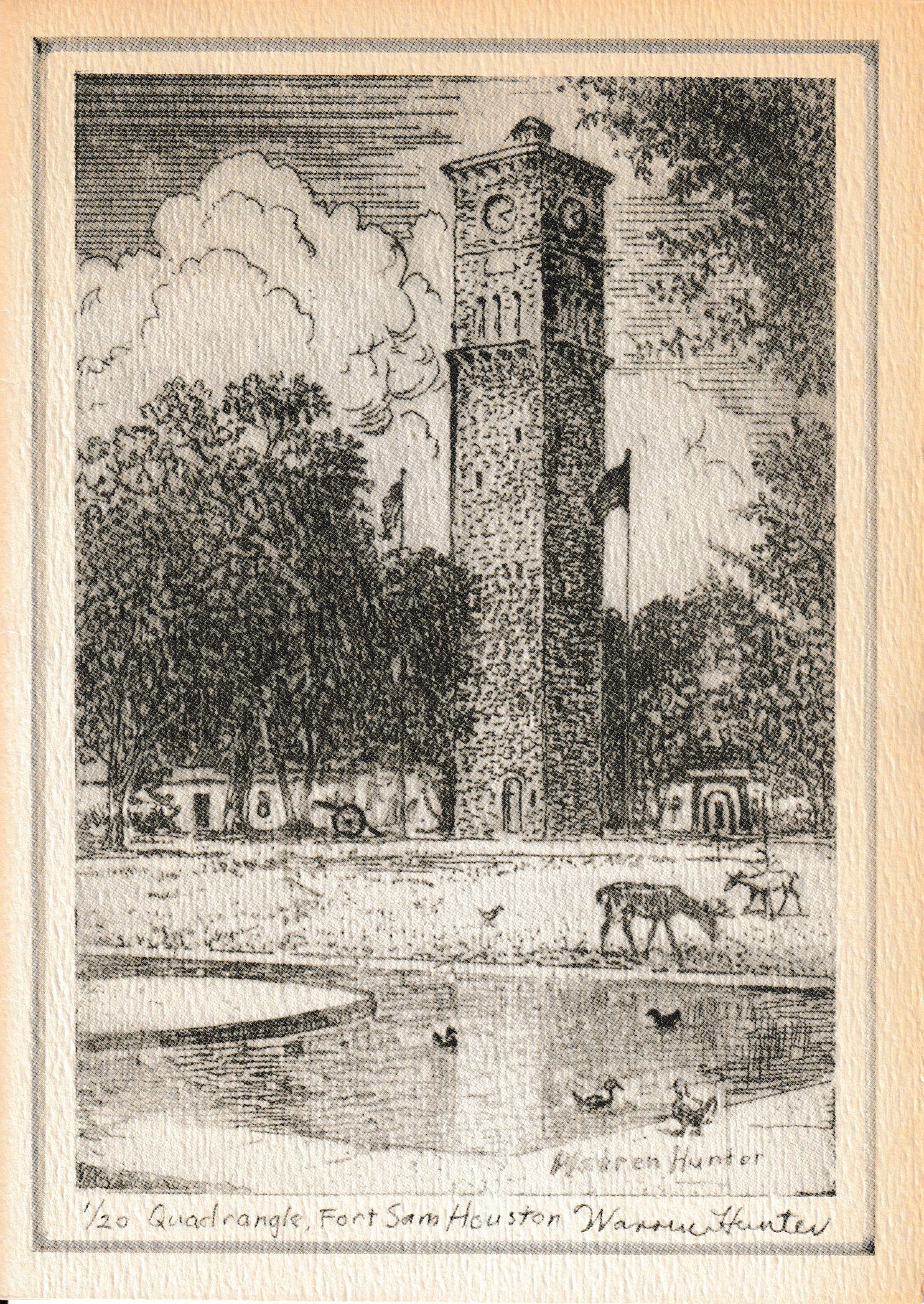 Warren Hunter signed #1/20 Fort Sam Houston Quadrangle greeting card. Southwest Research Institute commissioned this Warren Hunter etching of the Fort Sam Houston Quadrangle, San Antonio.Context