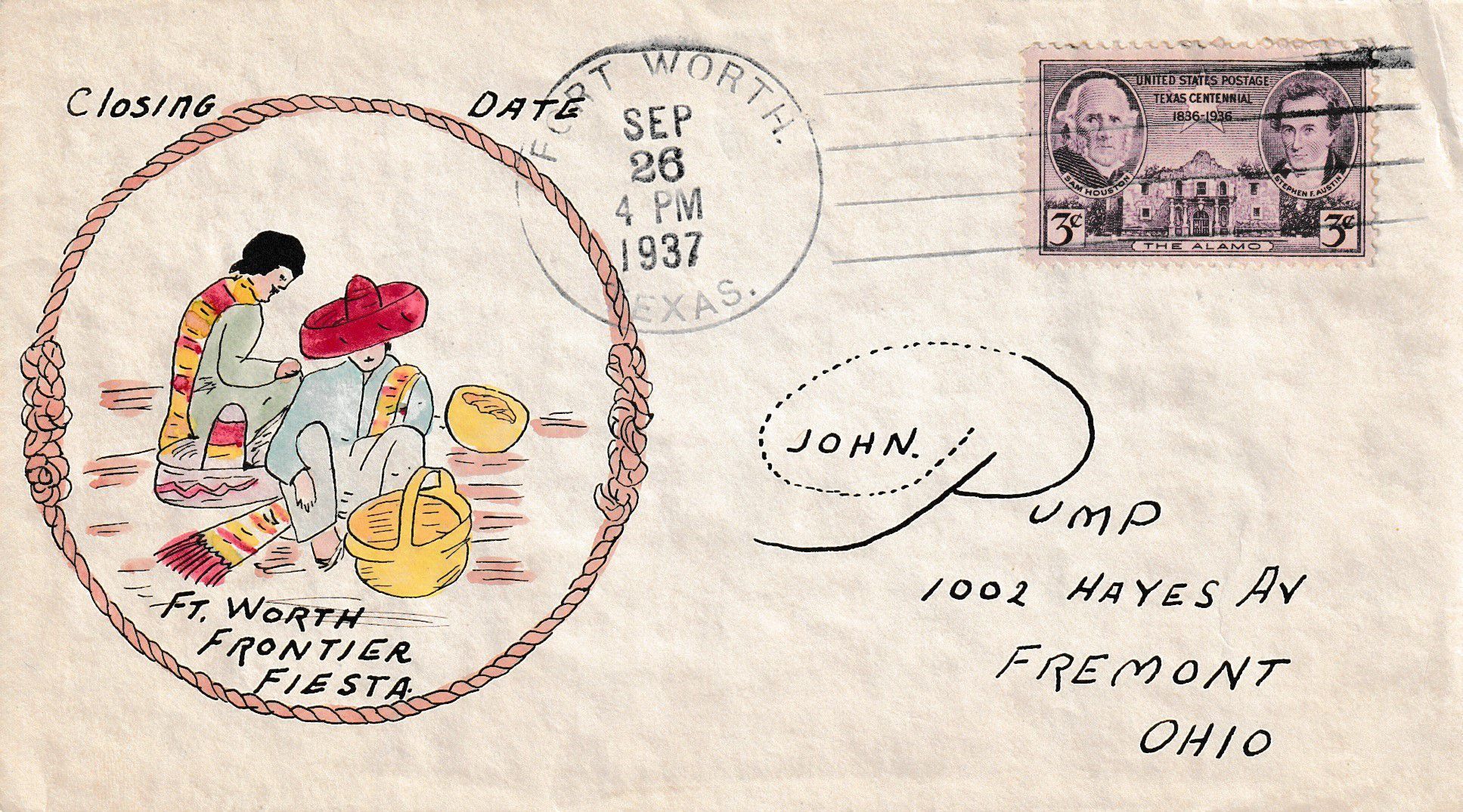 Hand painted cover by San Antonio, Texas artist Florence Edmiston commemorating the closing date of the 1936 Texas Centennial Frontier Centennial in Fort Worth, Texas.Context