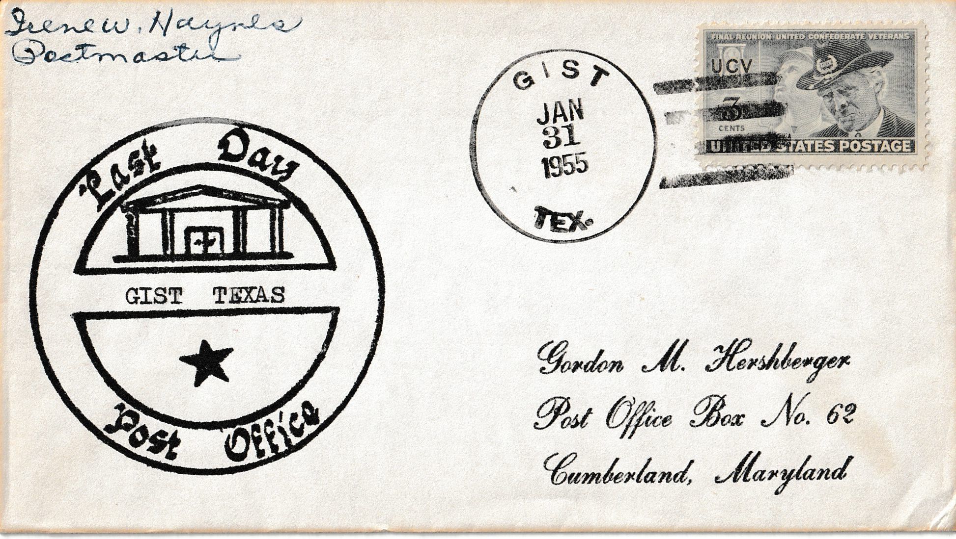 A “Last Day” cover postmarked on January 31, 1955, on the final day of business of the Gist Post Office. Signed by the postmaster.Context