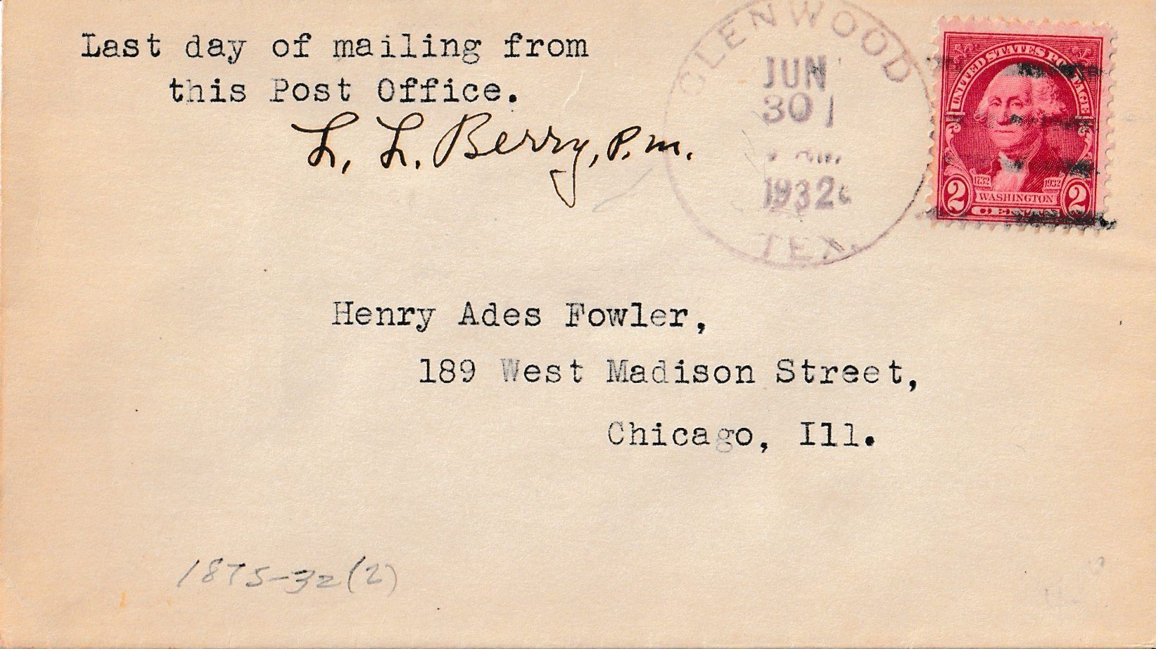 A “Last Day” cover postmarked on June 30, 1932, on the final day of business of the Glenwood Post Office. Signed by the postmaster.Context