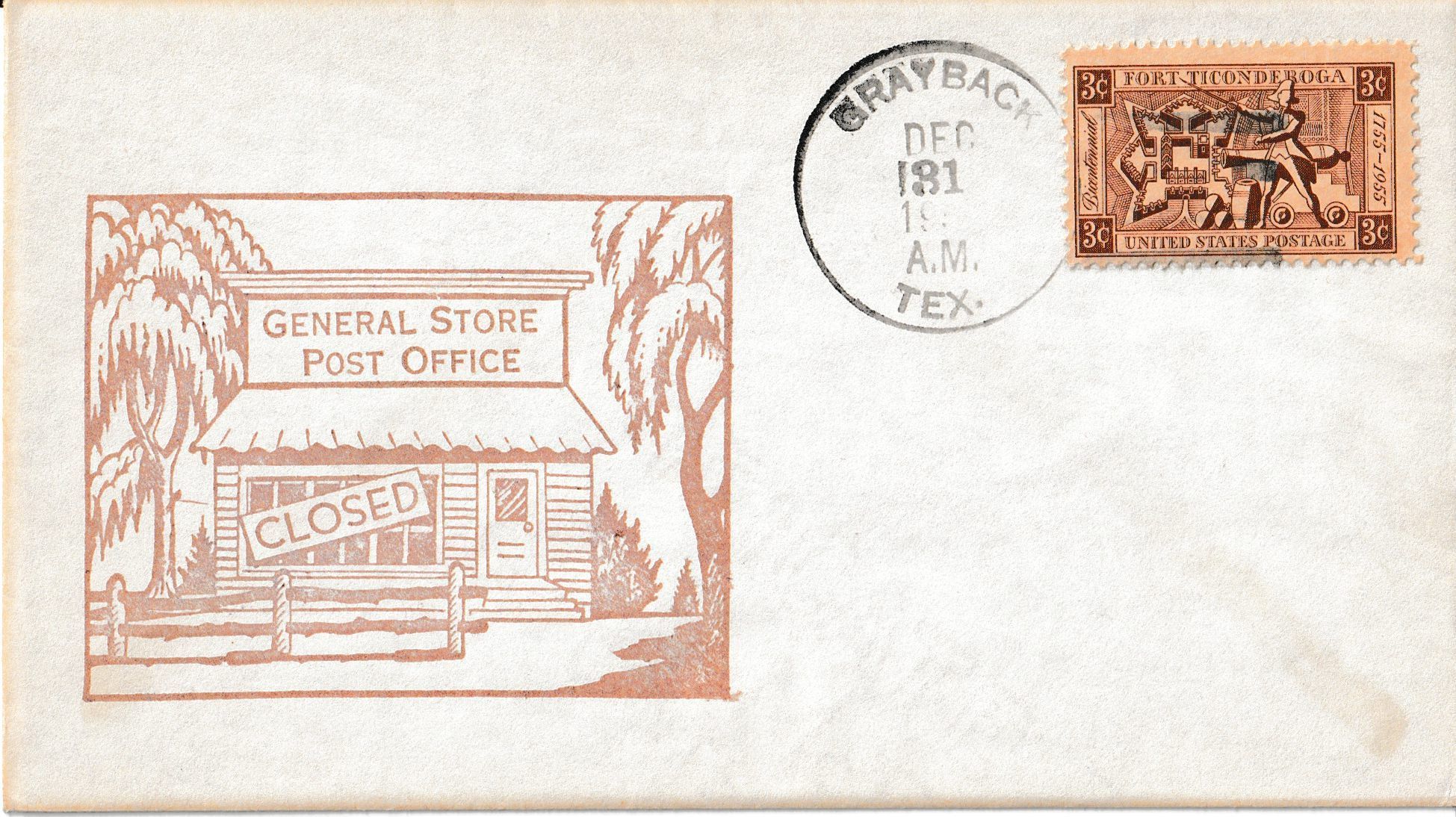 A “Last Day” cover postmarked on December 31, 1955, on the final day of business of the Grayback Post Office.Context