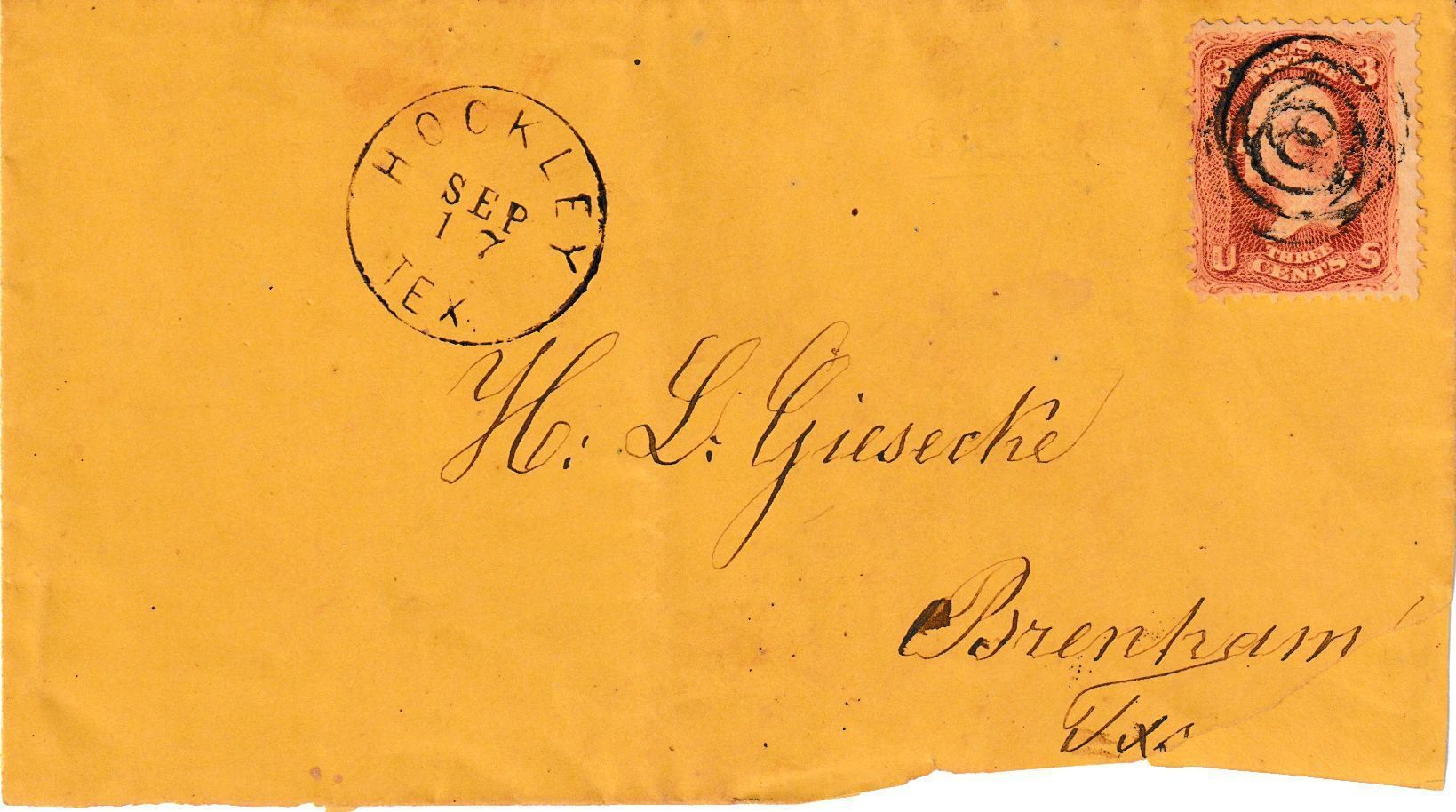 Cover addressed to “H. L. Giesecke / Brenham / Tx." Postmarked "HOCKLEY / SEP 17 / TEX."Context