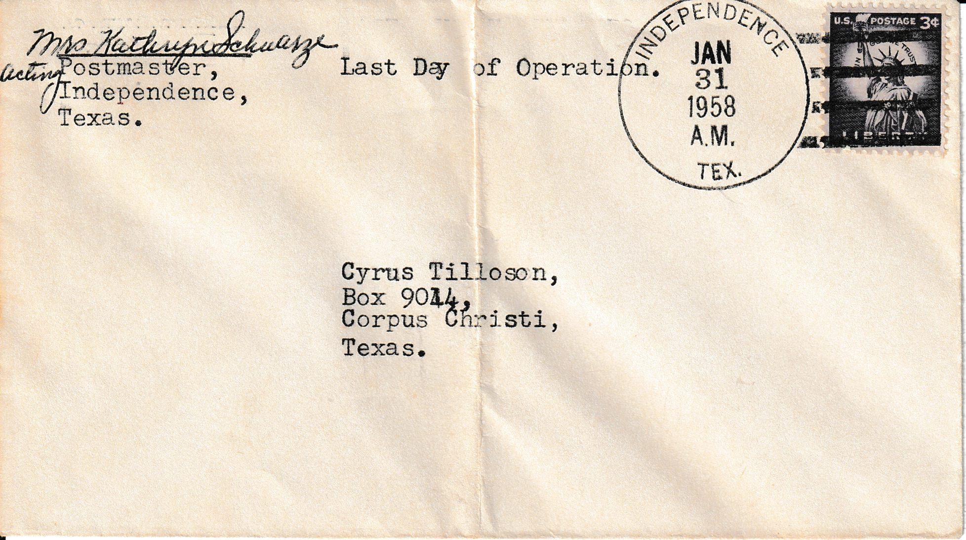 A “Last Day” cover postmarked on January 31, 1958, on the final day of business of the Independence Post Office. Signed by Mrs. Kathryn Schwarze, Acting Postmaster.Context