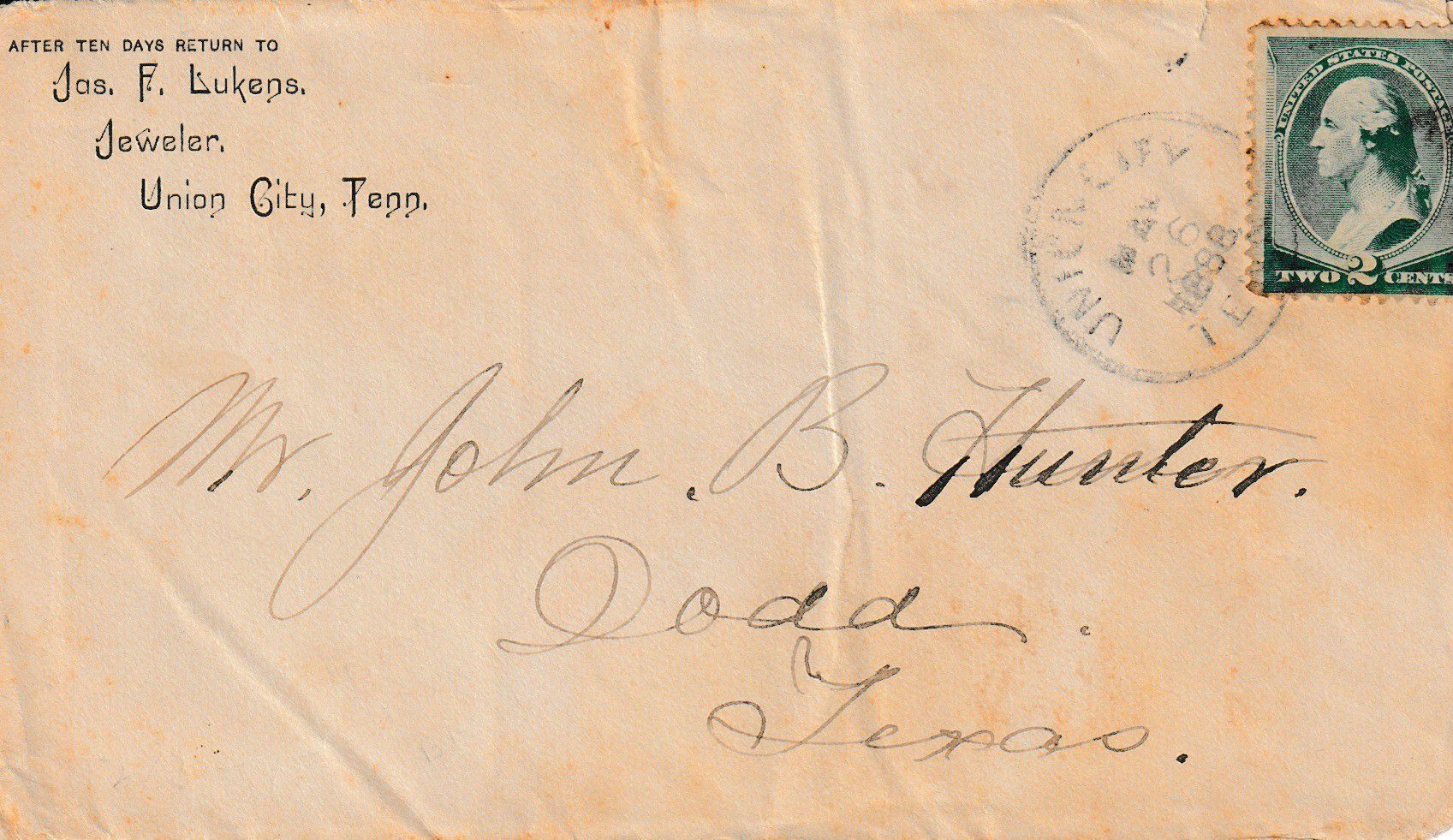 Cover from "Jos. F. Lukens, / Jeweler, / Union City, Tenn." addressed to “Mr. John B. Hunter / Dodd / Texas.” Postmarked on front "UNION CITY / MAY 26, 1888 / TENN." and on back "DODD / MAY 29, 1888 / TEXAS."Context