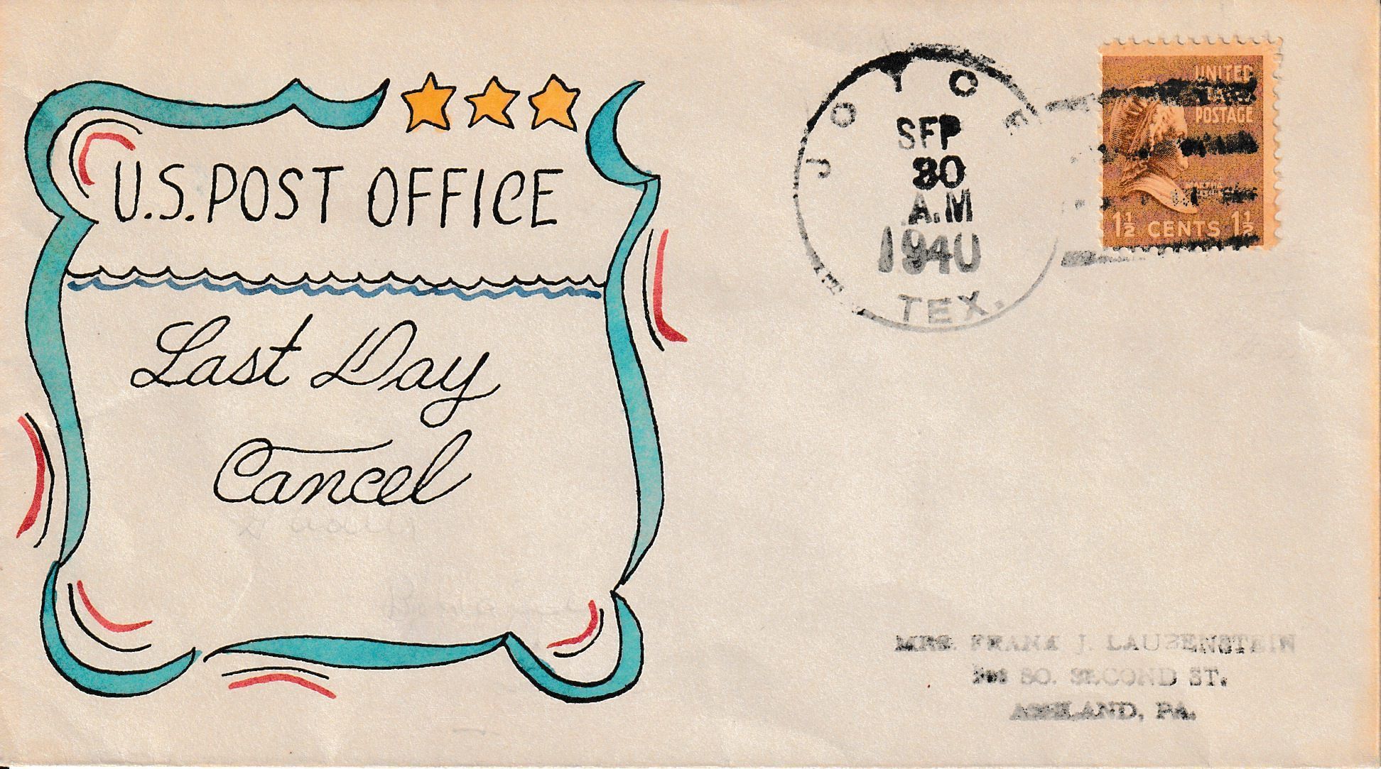 A “Last Day” cover postmarked on September 30, 1940, on the final day of business of the Joyce Post Office. Handdrawn cachet by Gladys Adler of Bellaire, Texas.Context