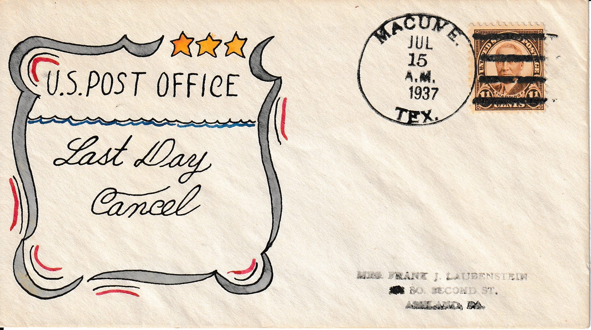 A “Last Day” cover postmarked on July 15, 1937, on the final day of business of the Macune Post Office. Hand painted by Texas cachet maker Gladys Adler.Context