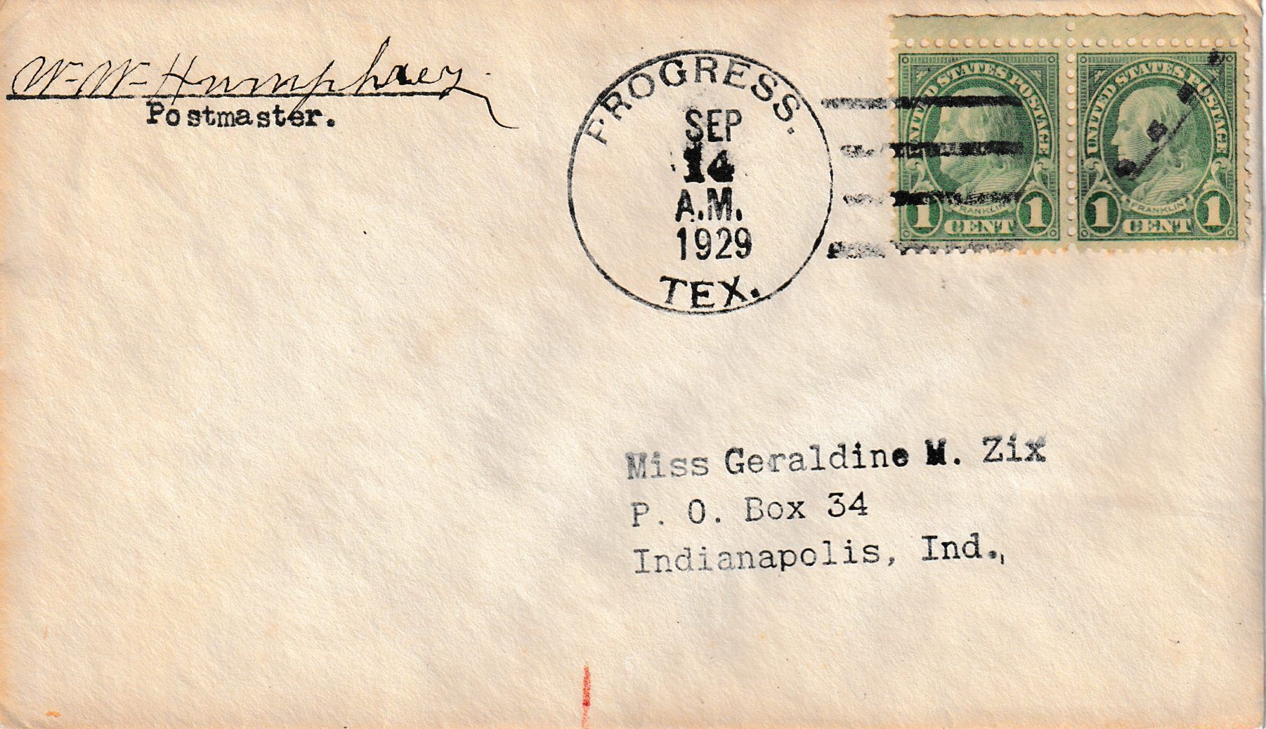 A Progress postmarked cover on September14, 1929. Assumed to be a “Last Day” cover as the Progress Post Office was only open for two years: 1927 to 1929. Signed by the postmaster.Context