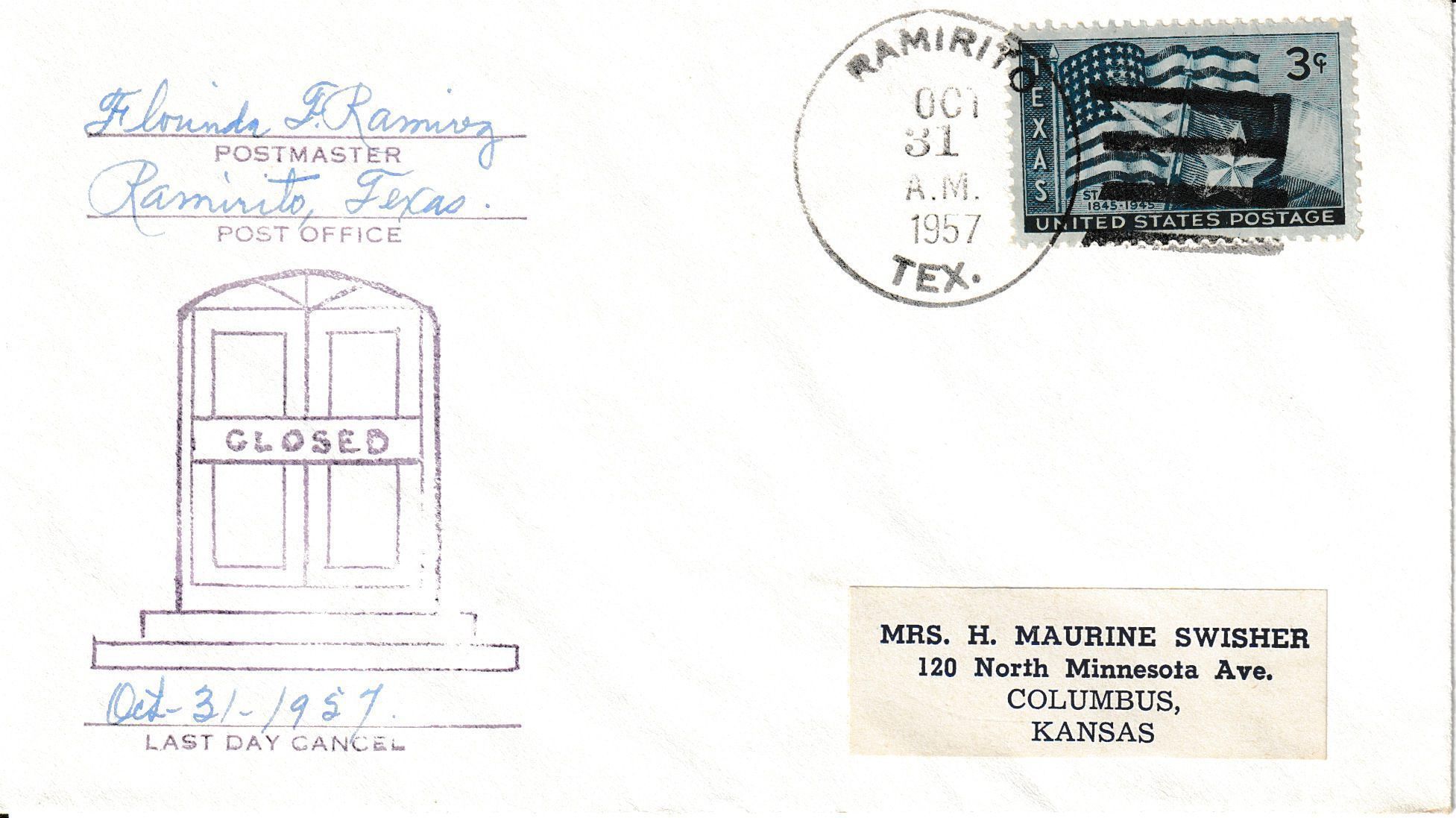 A “Last Day” cover postmarked on October 31, 1957, on the final day of business of the Ramarito Post Office. Signed by the postmaster.Context