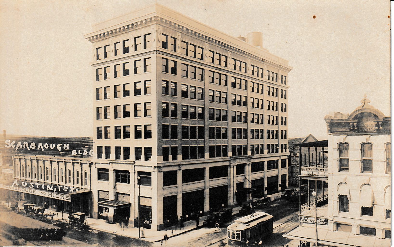 At a height of 110 feet, the 8-story Scarbrough Building was Austin’s first “skyscraper” and briefly held the title of the tallest private building in Texas when it was completed in 1910. Named after the regional department store that it originally housed, the lower floors of the Chicago-style building were “modernized” in the Art Deco style in 1931.Context
