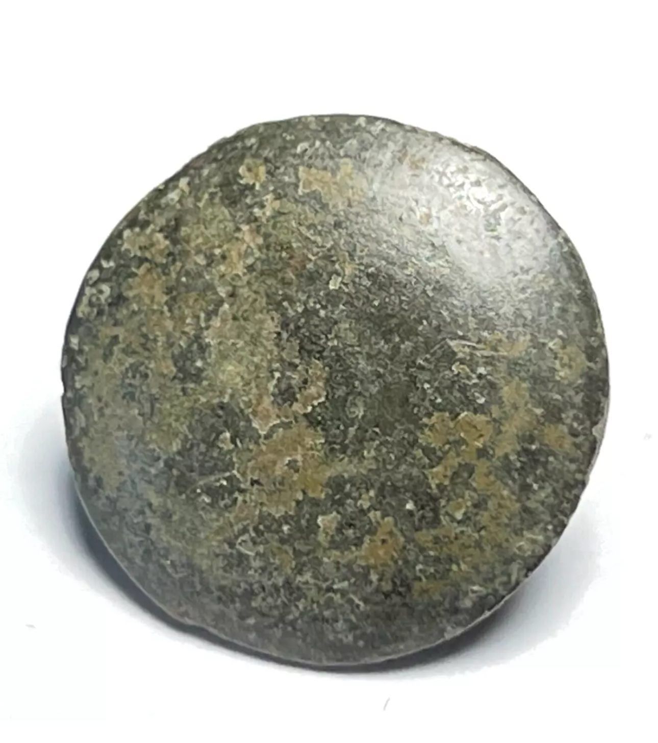 The button is hand cast, has a slight concave reverse with a beveled edge, is made of copper alloy, and has an integral shank with drilled eyelet.Context