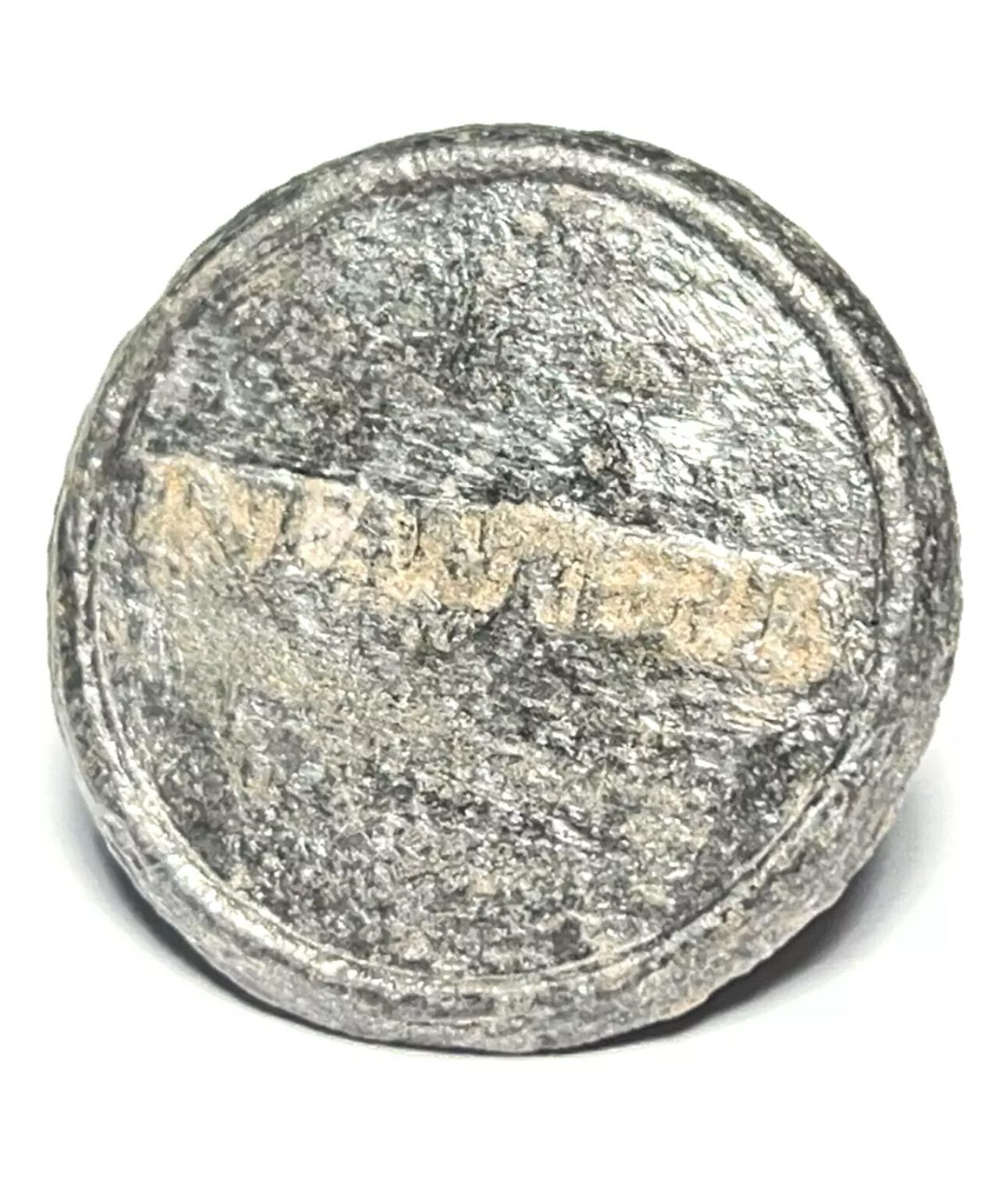 Enlisted issue infantry “INFANTERIA" coat button, recovered in Louisiana, hand casted of pewter, and may have originally been coated in tin.