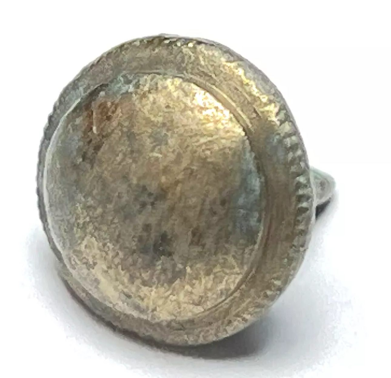 Mid 1600s Spanish military doublet button, reeded edge, hand cast, of copper alloy, and has an integral shank with drilled eyelet.Context