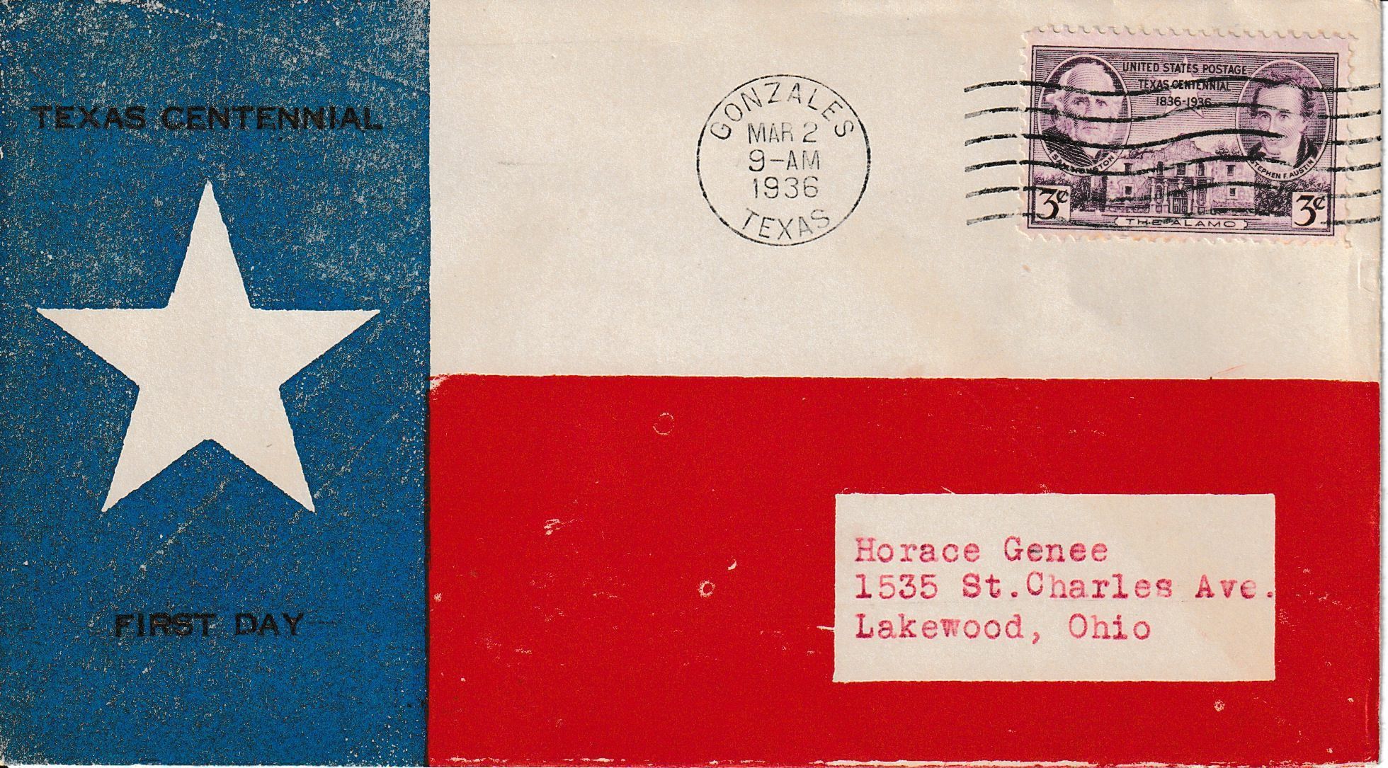 Texas Lone Star Flag cover with the words "Texas Centennial" printed in black above the star and "First Day" printed in black below the star. Postmarked on March 2, 1936.Context