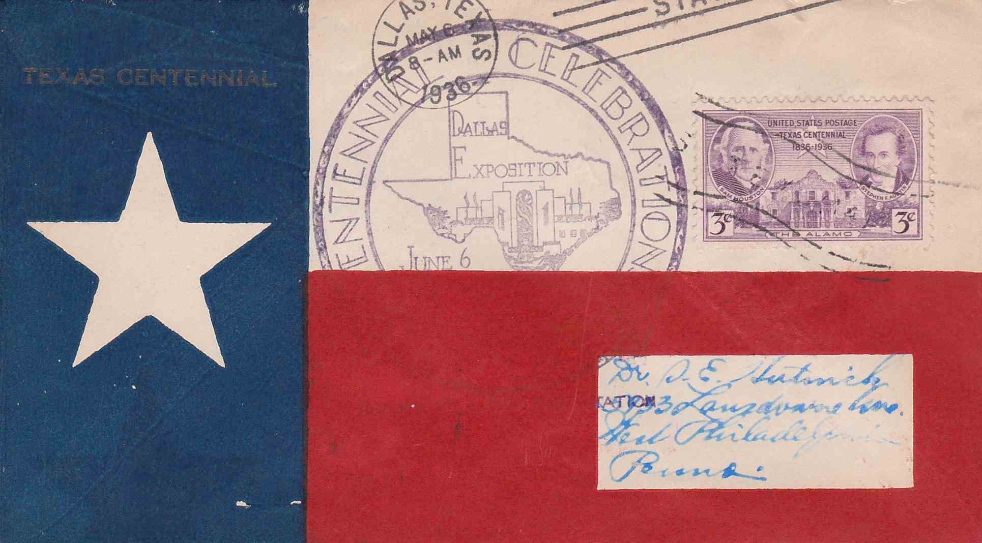 Texas Lone Star Flag hand drawn over the special June 6, 1936 Dallas Exposition Centennial Celebration cancellation. "Texas Centennial" printed in gold above the star. Cover postmarked in Dallas, Texas on May 6, 1936.Context