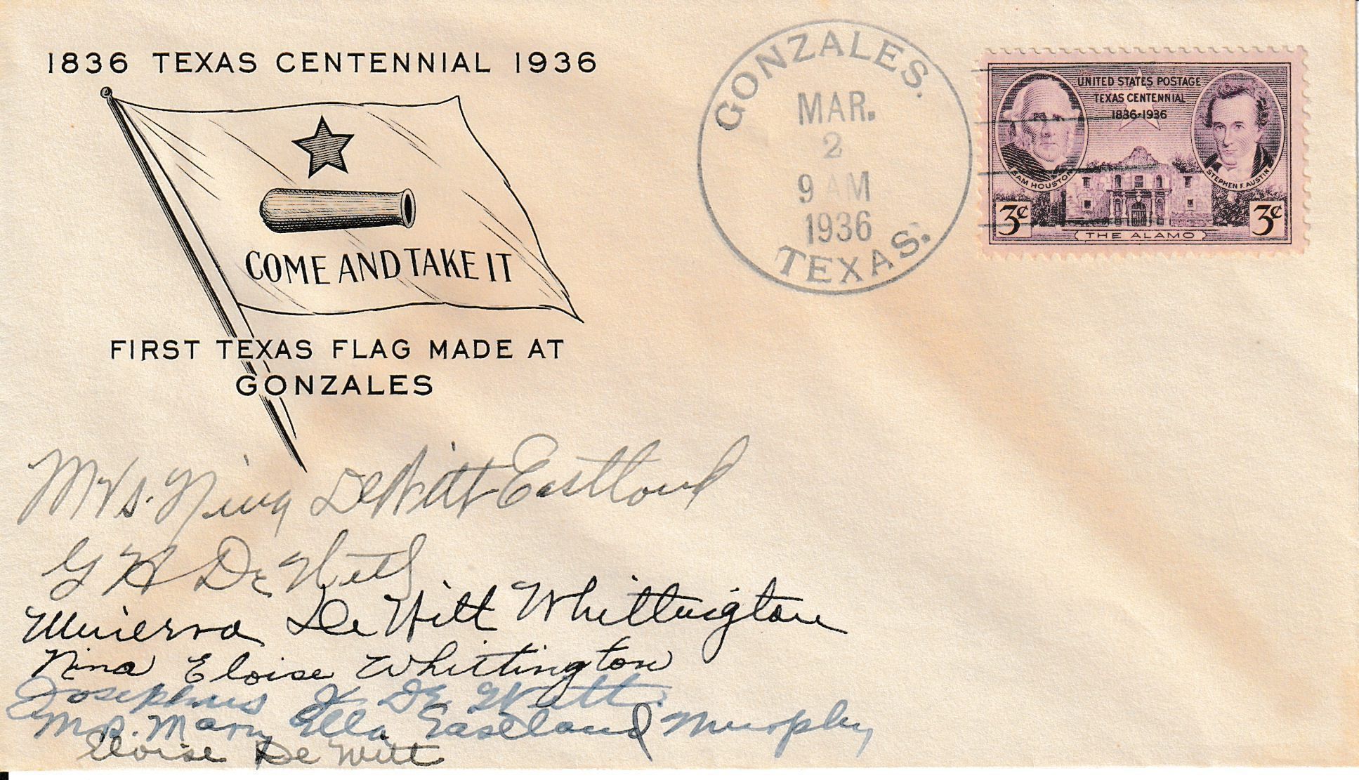 First Day Cover for 3c Texas Centennial commemorative stamp. Cachet features the “Come and Take It” flag, made by Elvira DeWitt. Gonzales was the only town in Dewitt's Colony.Context