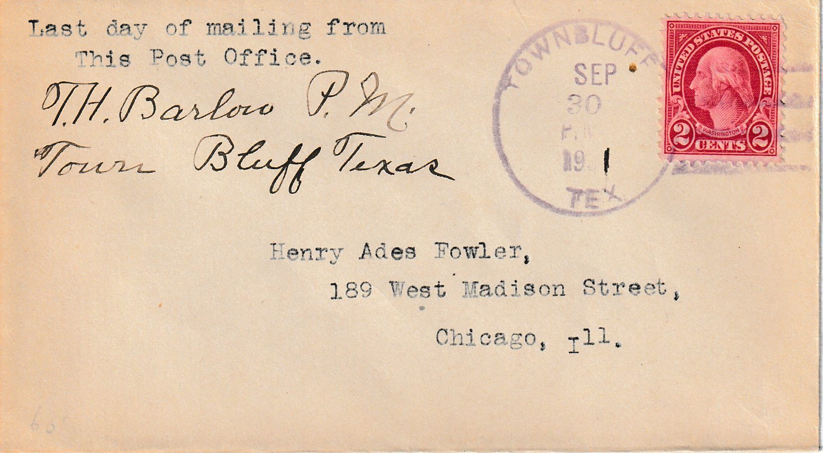 A “Last Day” cover postmarked on September 30, 1931, on the final day of business of the Town Bluff Post Office. Signed by the postmaster.Context