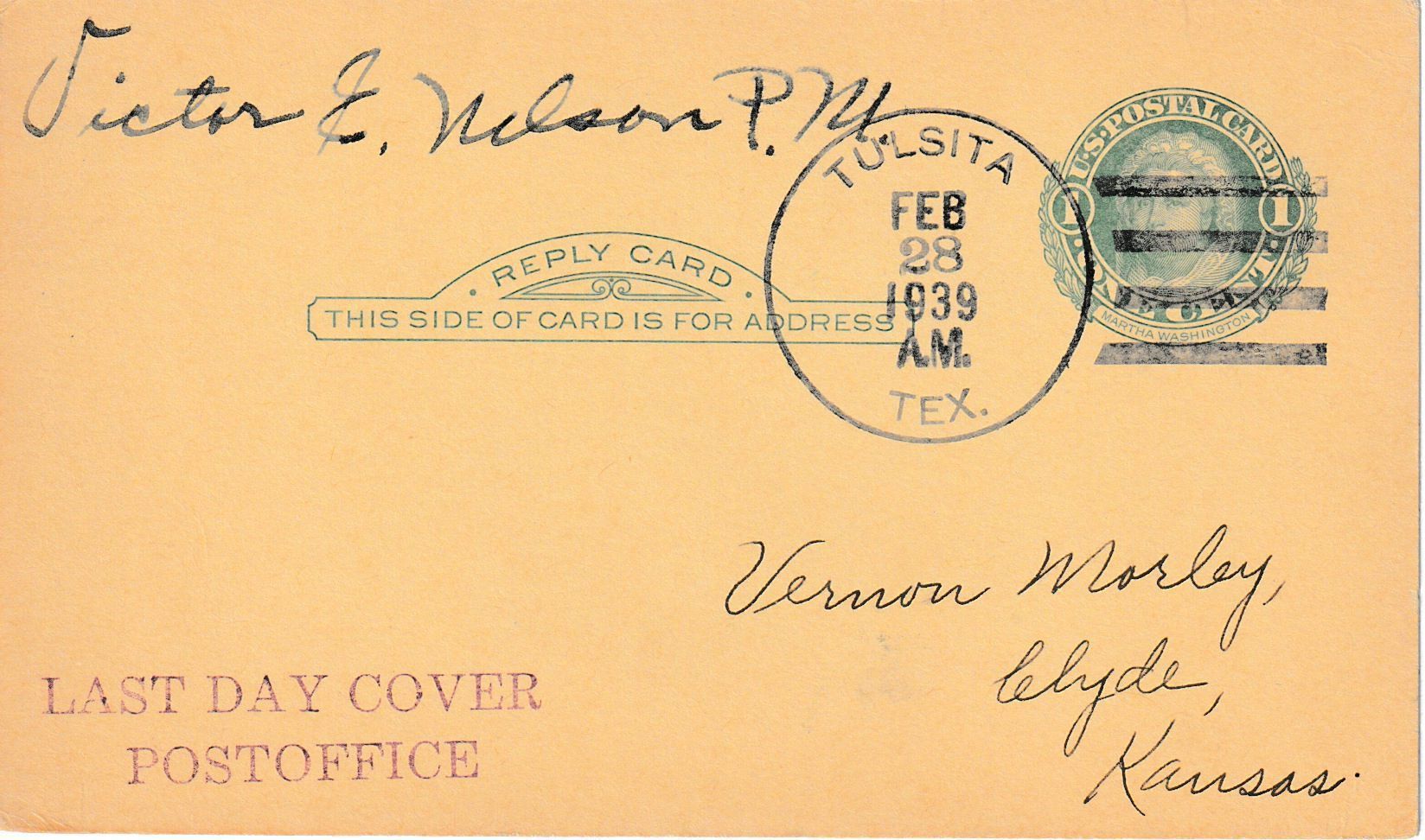 A “Last Day” postal card postmarked on February 28, 1939, on the final day of business of the Tulsita Post Office. Signed by the postmaster.Context